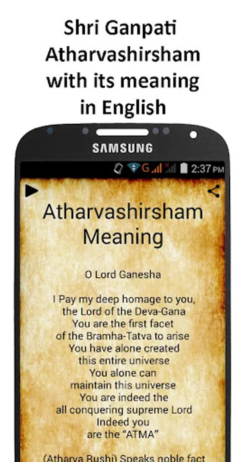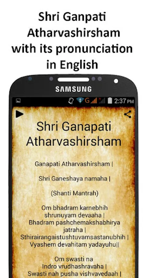 This app includes Ganpati Atharvashirsham with Audio clip as well as its pronunciation and meaning in english.
