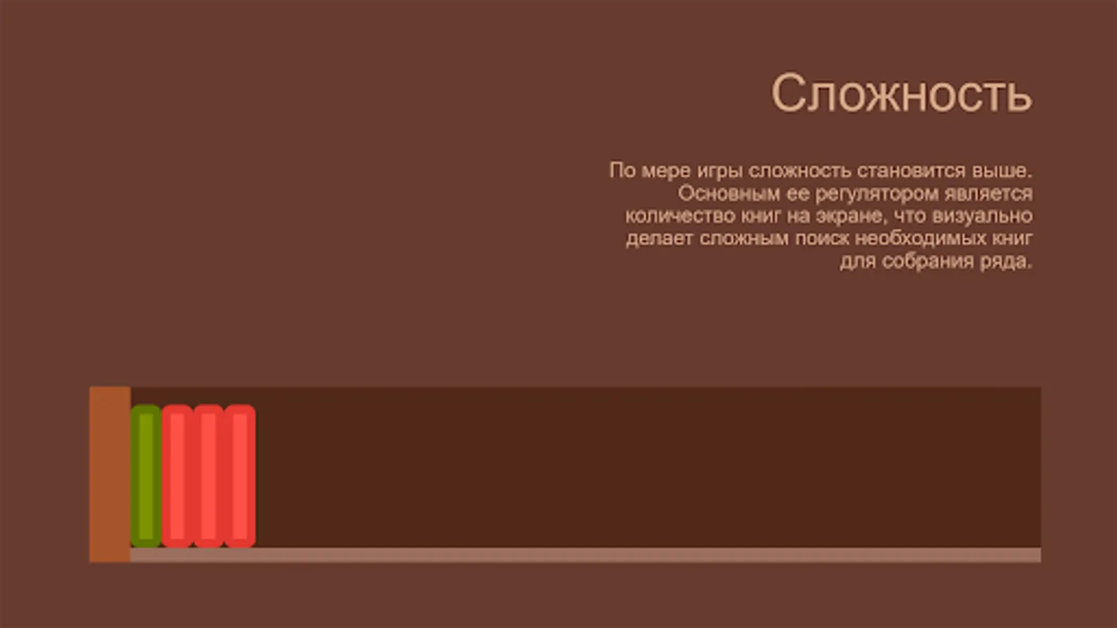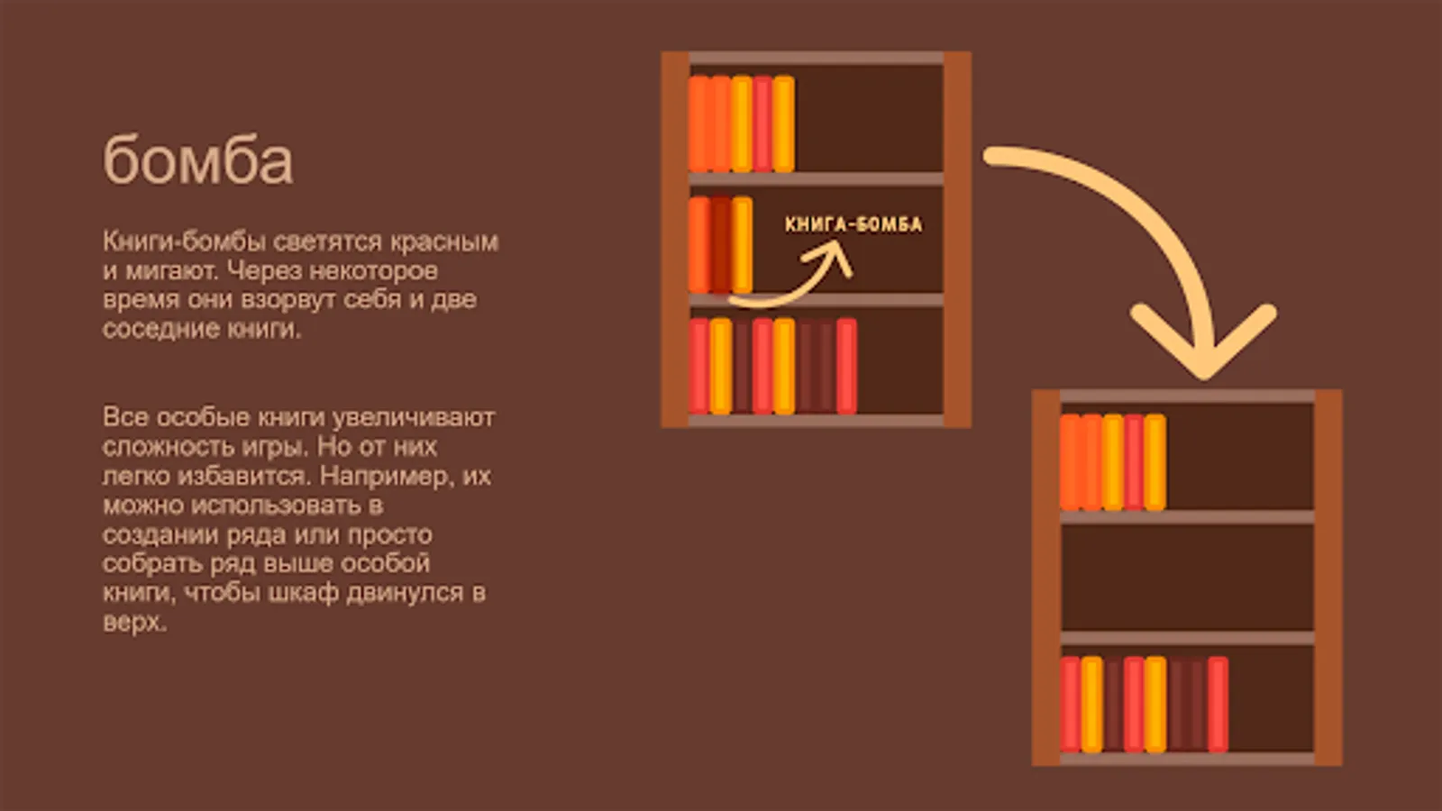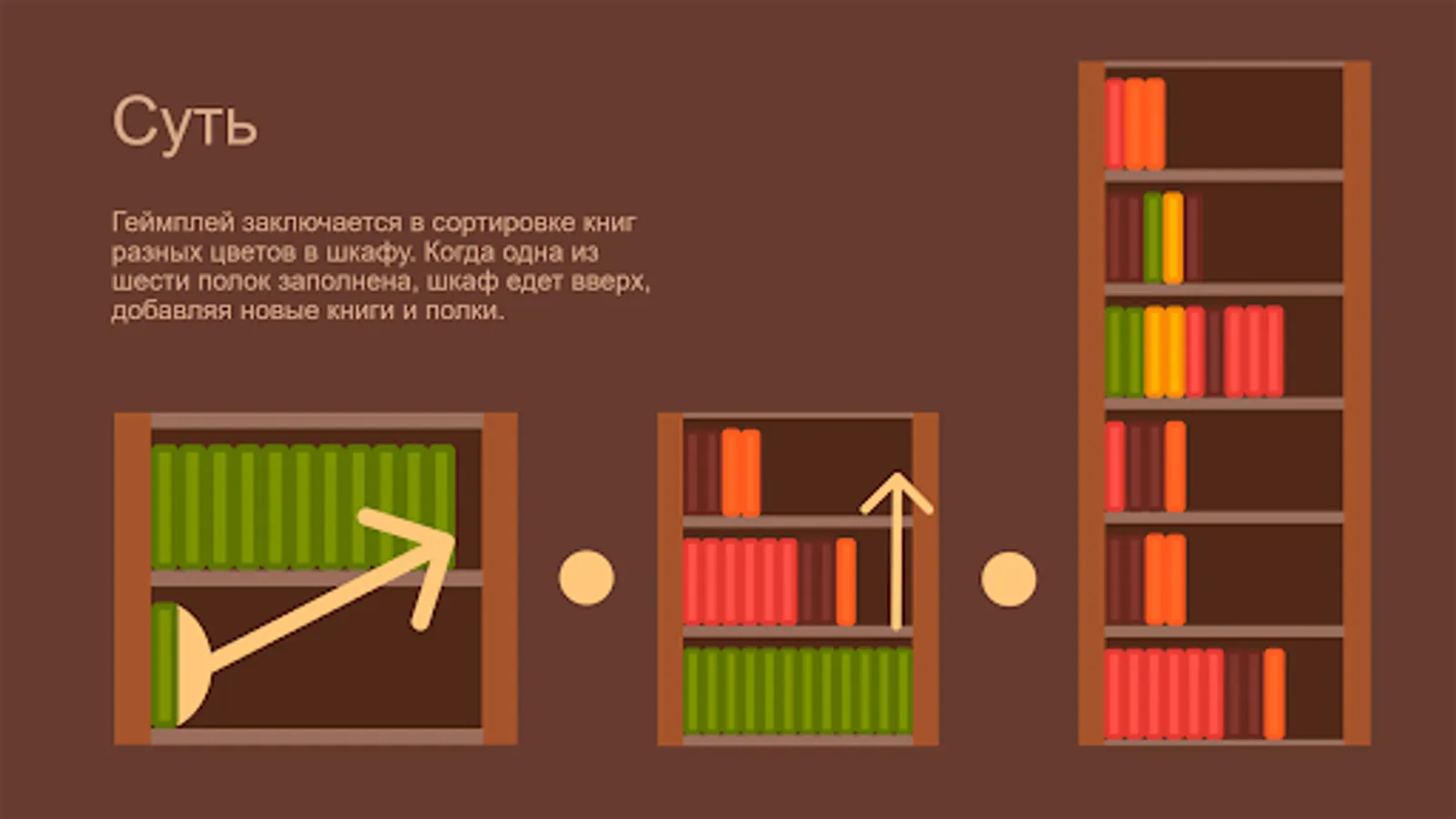 Fight chaos, take a break from business and relax! Sort books of different colors in the bookcase. When one of the six shelves is full, the cabinet will move up, adding new books and shelves. The higher you are, the more books. On the way you will meet dangerous books-bombs, books-timers and books-stones that will interfere with you. Collect bookmarks and popular quotes from authors that fall out of books! Discover all the themes and don't forget to enjoy the game!