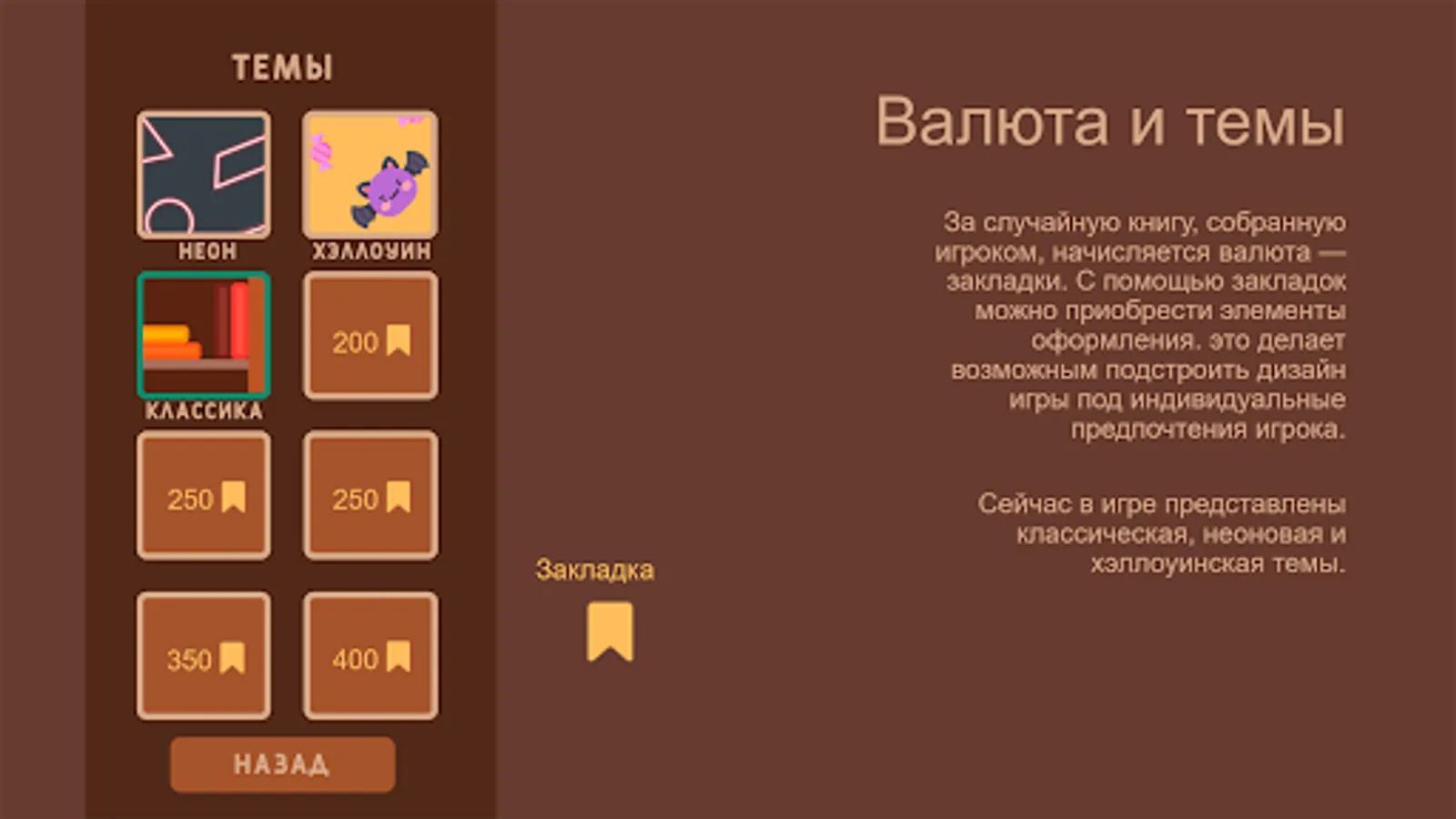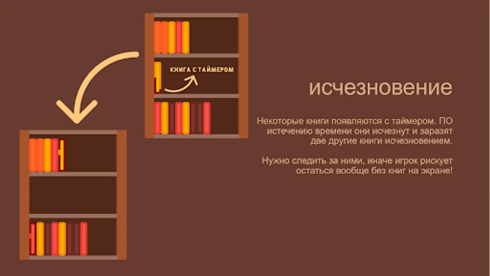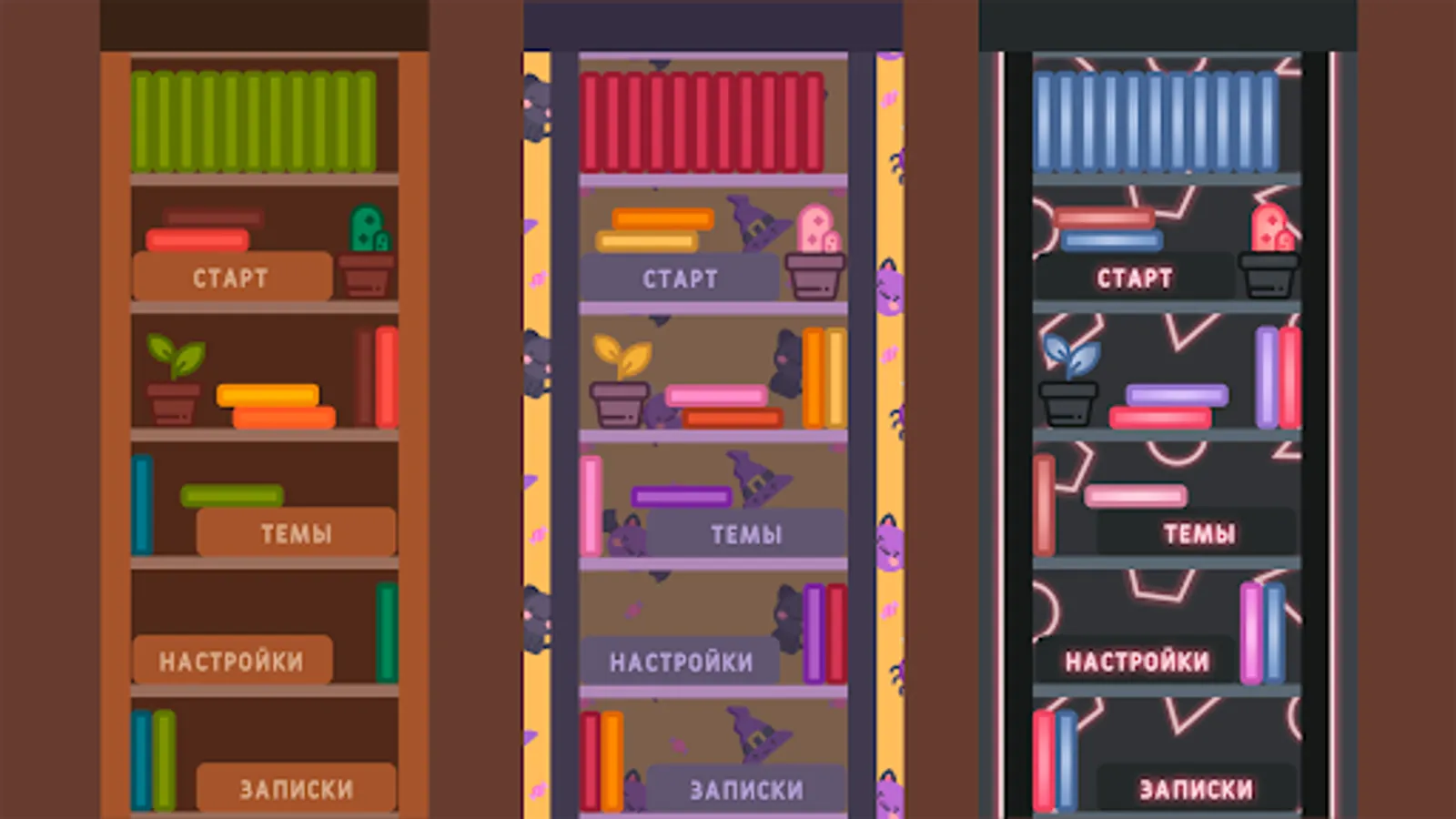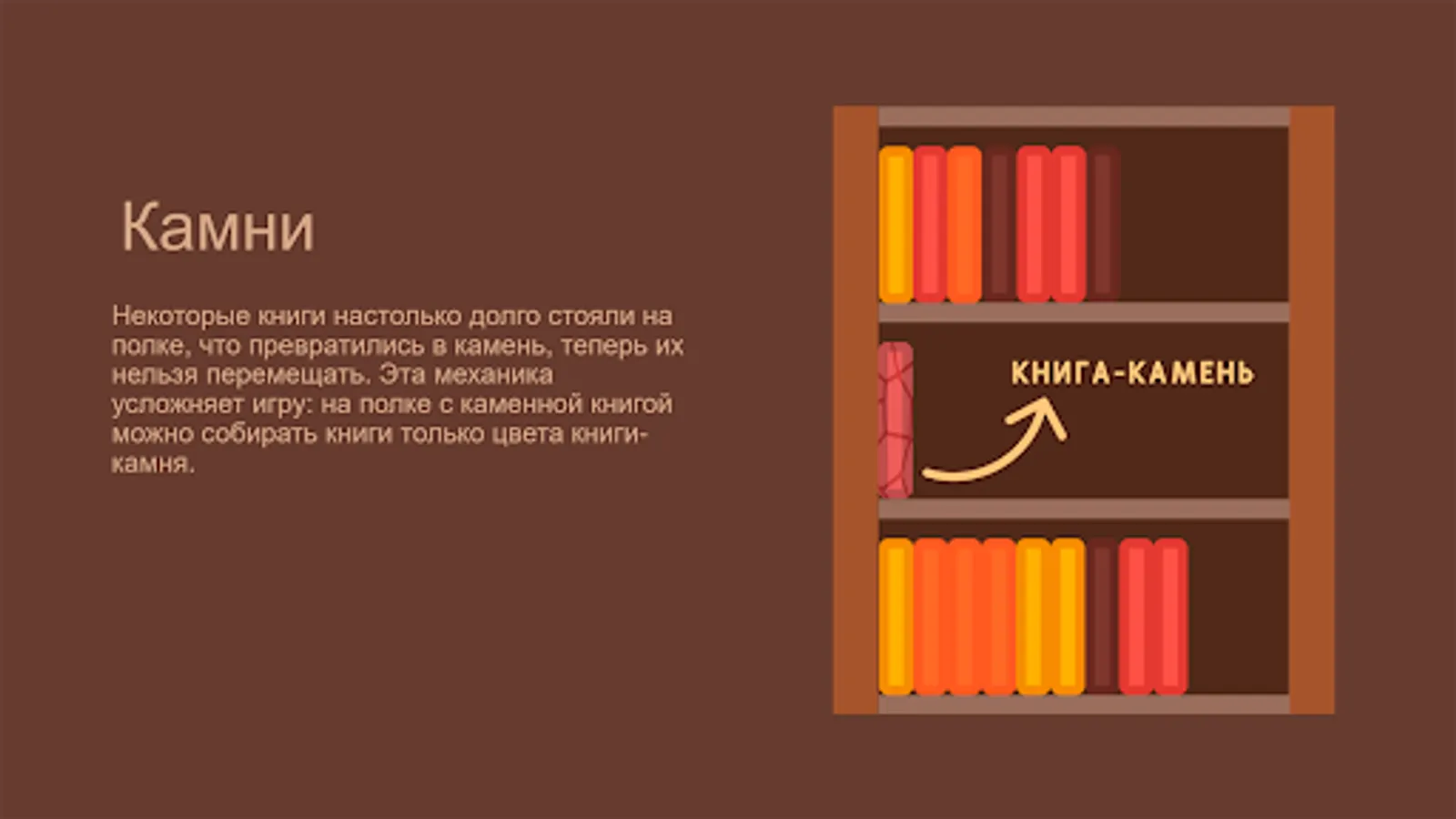 Fight chaos, take a break from business and relax! Sort books of different colors in the bookcase. When one of the six shelves is full, the cabinet will move up, adding new books and shelves. The higher you are, the more books. On the way you will meet dangerous books-bombs, books-timers and books-stones that will interfere with you. Collect bookmarks and popular quotes from authors that fall out of books! Discover all the themes and don't forget to enjoy the game!