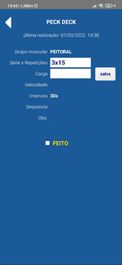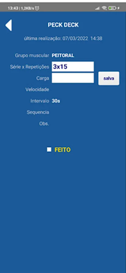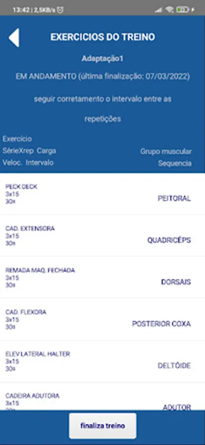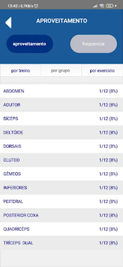 Visualization of the training sheet with an individual record of the exercise performed with detail of the frequency and last training performed.