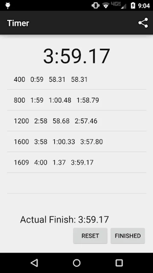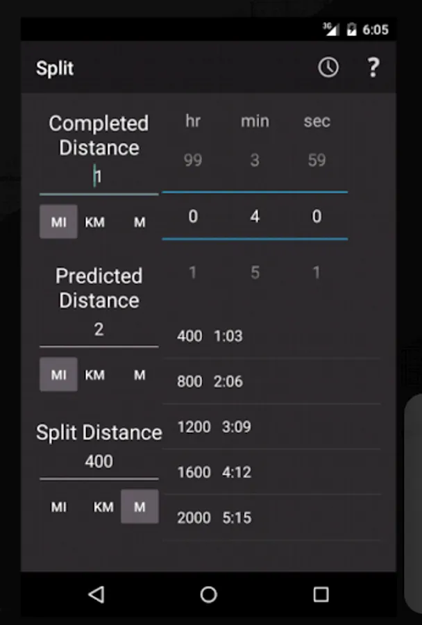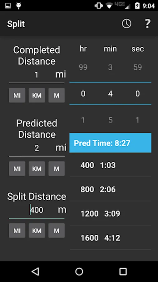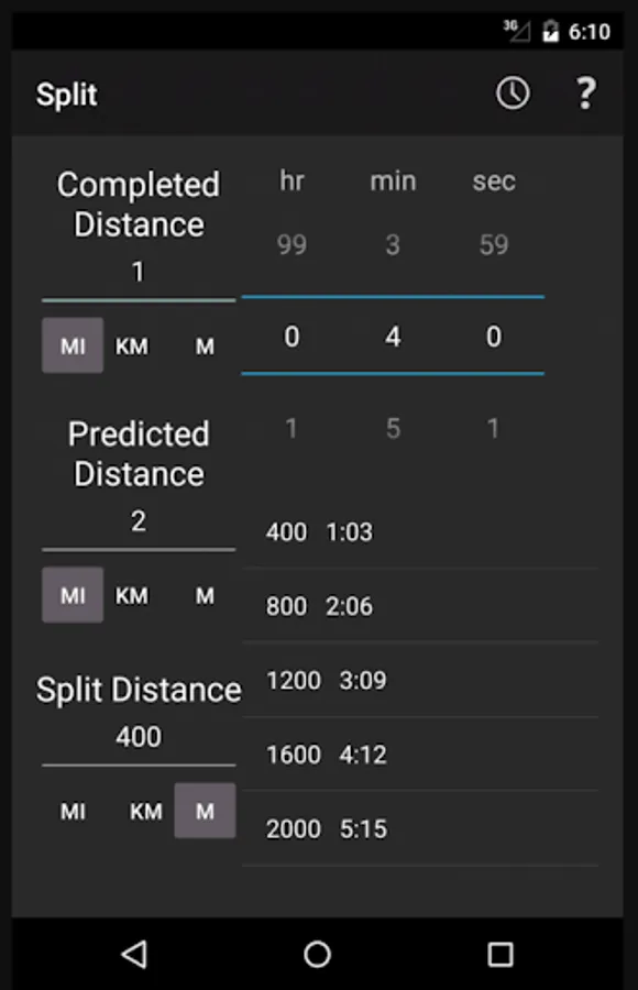 After entering a distance you want to predict and a split distance you are interested in using, the splits and predicted finish time will be displayed. The timer icon in the top right will produce a timer with split information.