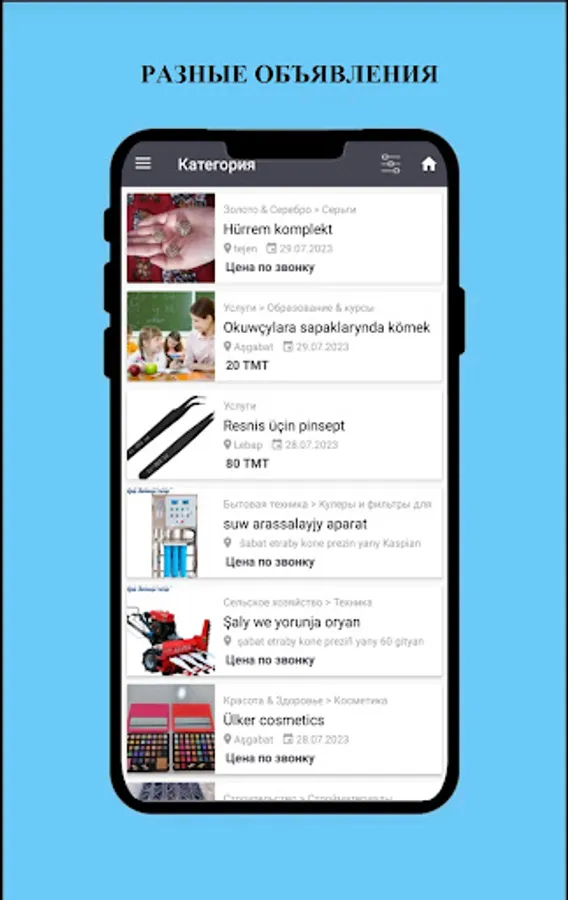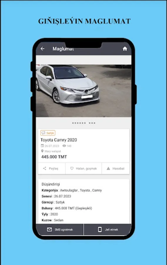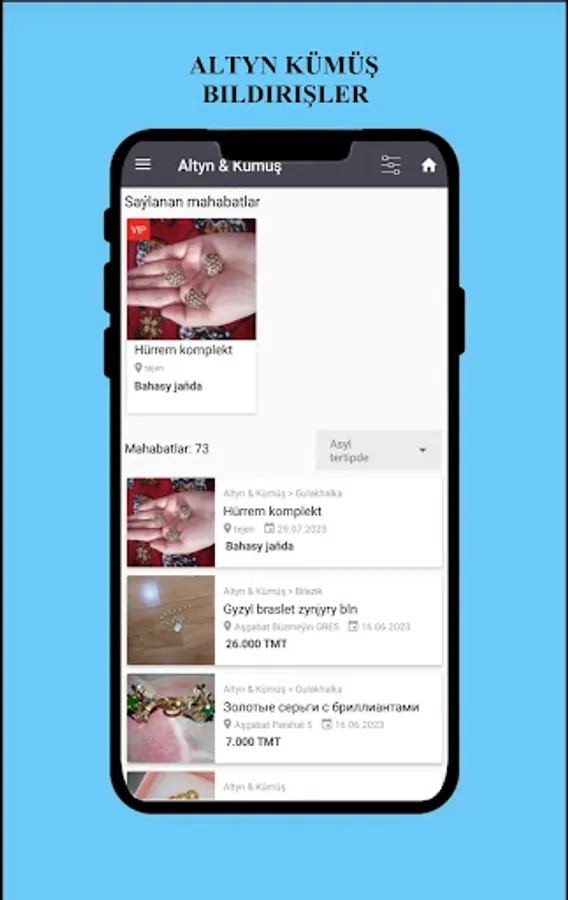 Awtoulaglary, altyn-kümüş şaý sepleri we beýleki bildirişleri satmak we satyn almak üçin niýetlenen bu programmada özüňize gerekli awtoulagy ýa-da beýleki harytlary tapyp we satyp bilersiňiz.