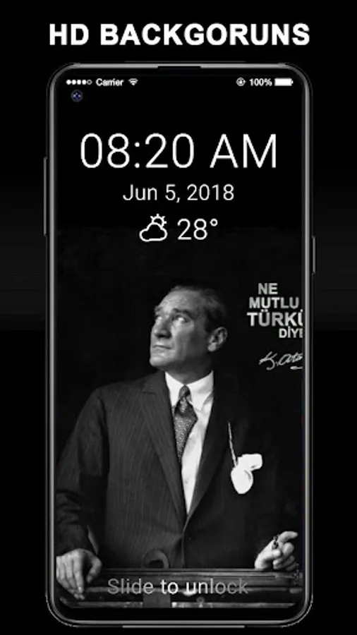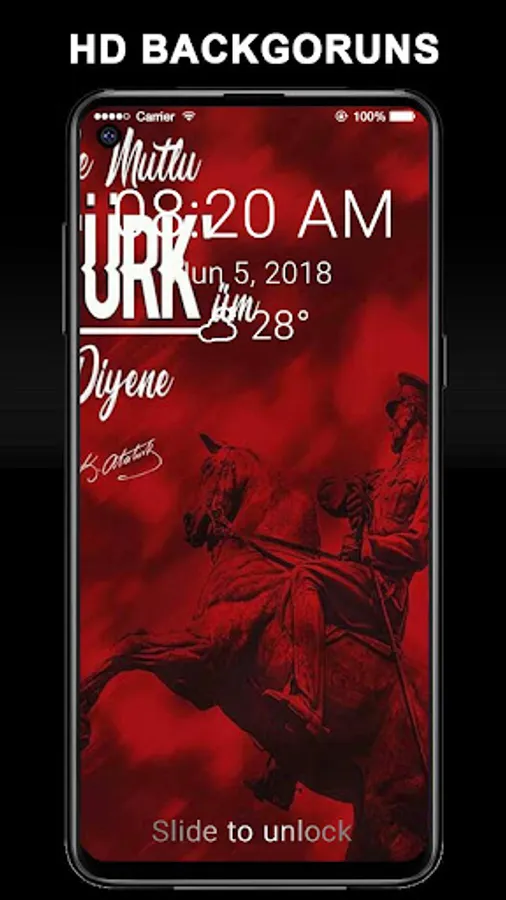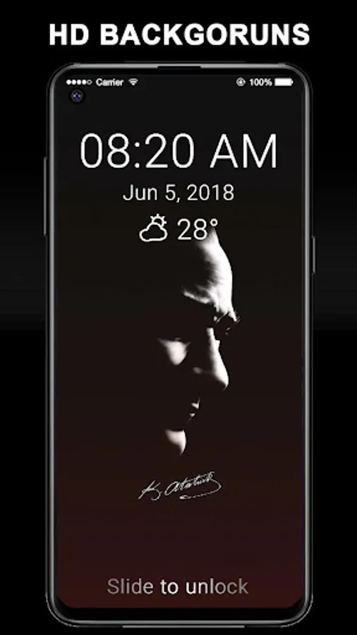 Atatürk 2019 Wallpapers Slide Unlock Screen will help you to lock your screen by passcode lock and make your screen looks like phone lock screen lock screen . Cool wallpapers and in the same time you save your privacy with this lock screen app, lock screen allow you to set a passcode to protect your privacy , or you can just using slide to unlock without pin code.
