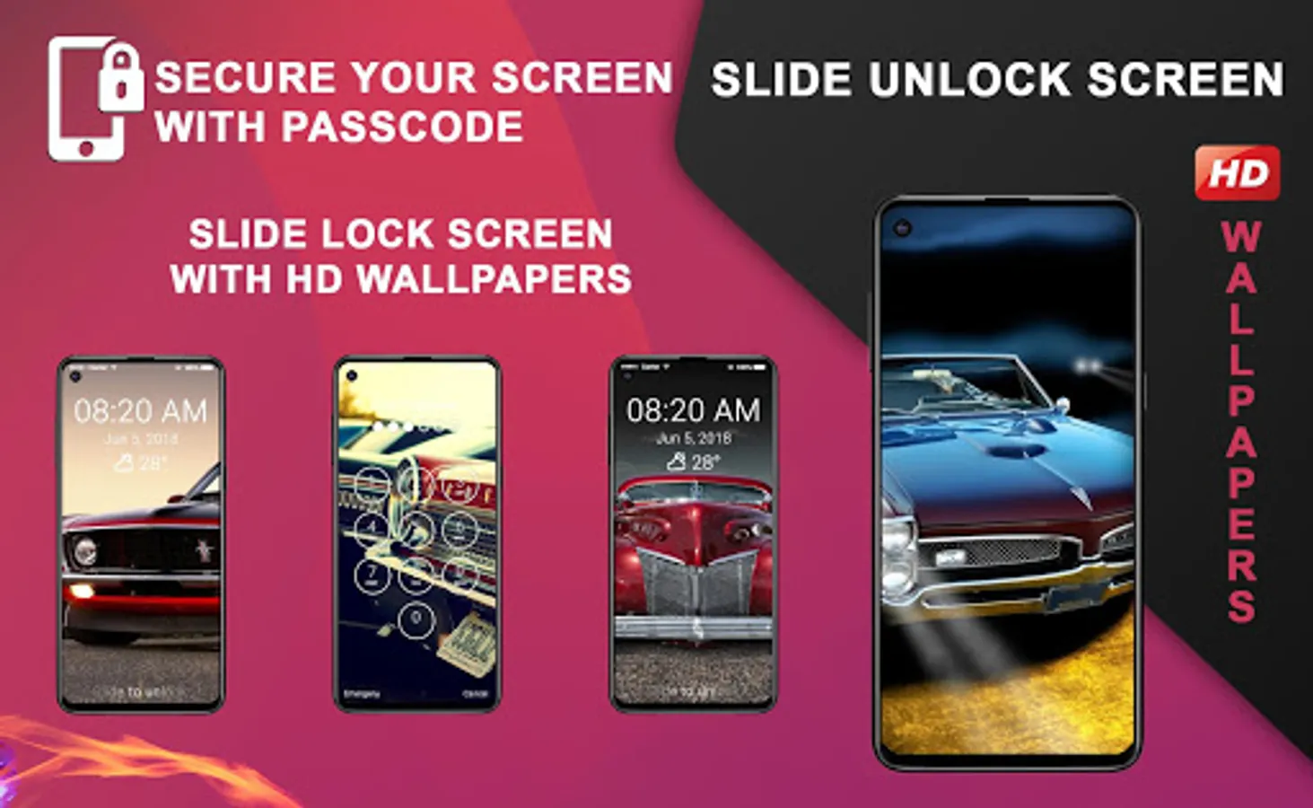 Classic Car HD Wallpapers Slide Unlock Screen Features: