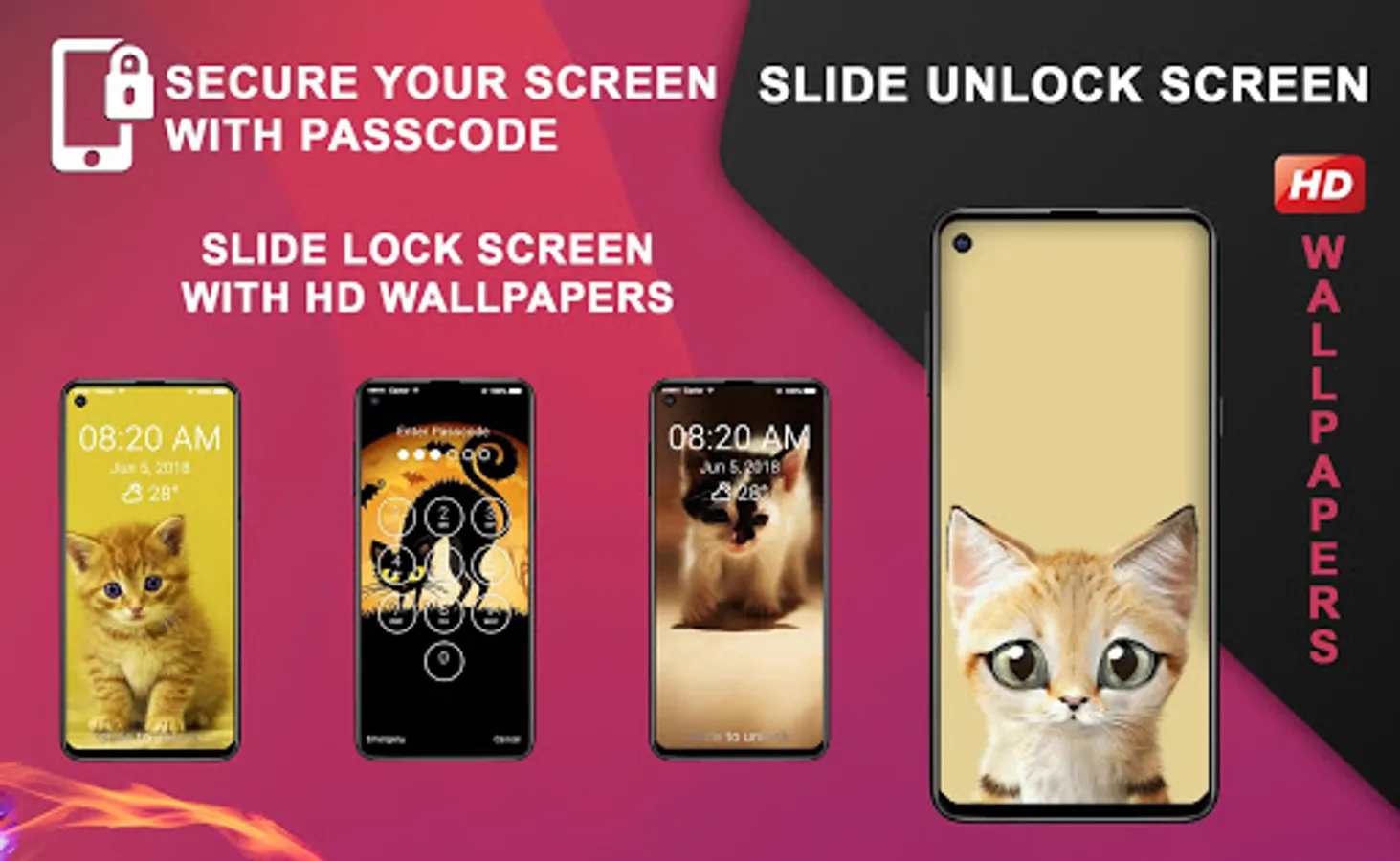 Kitten 2019 Wallpapers Slide Unlock Screen is the best keypad lock screen like phone lock screen to set password/passcode/pin for your lock screen.