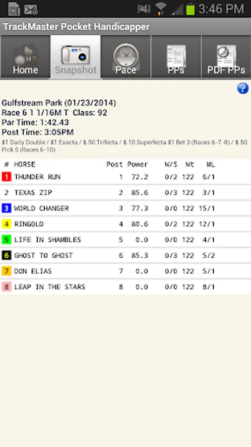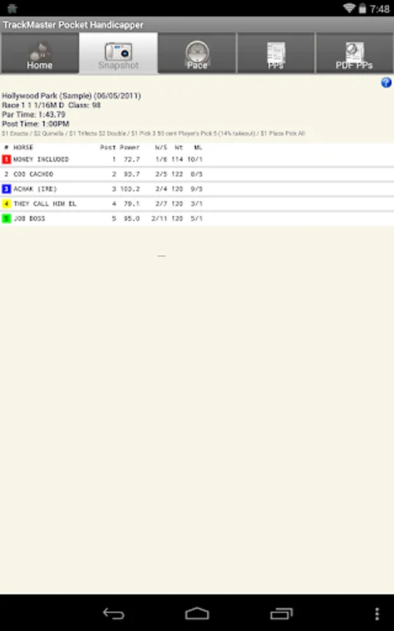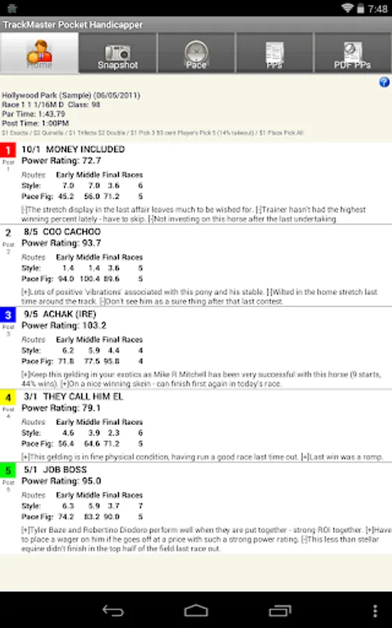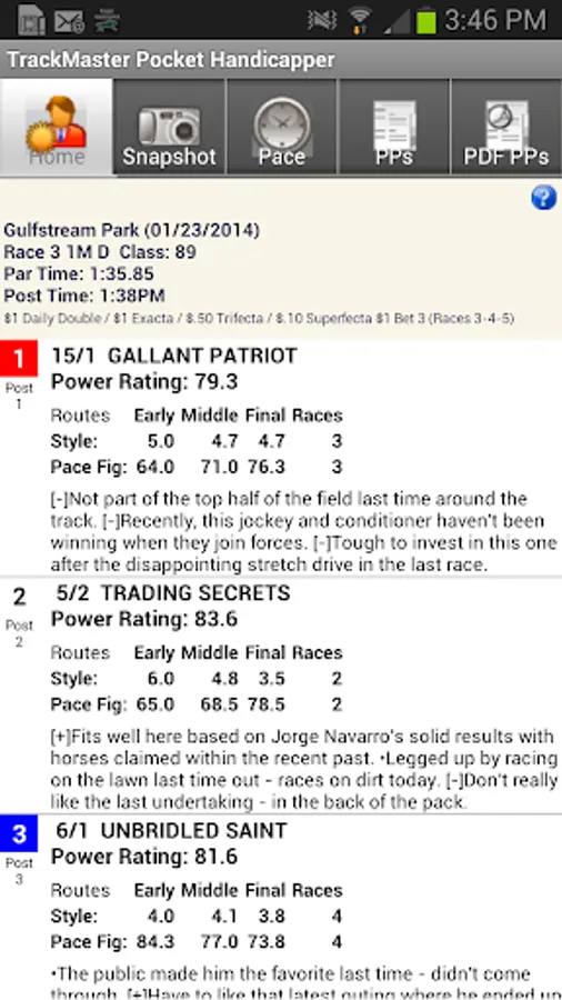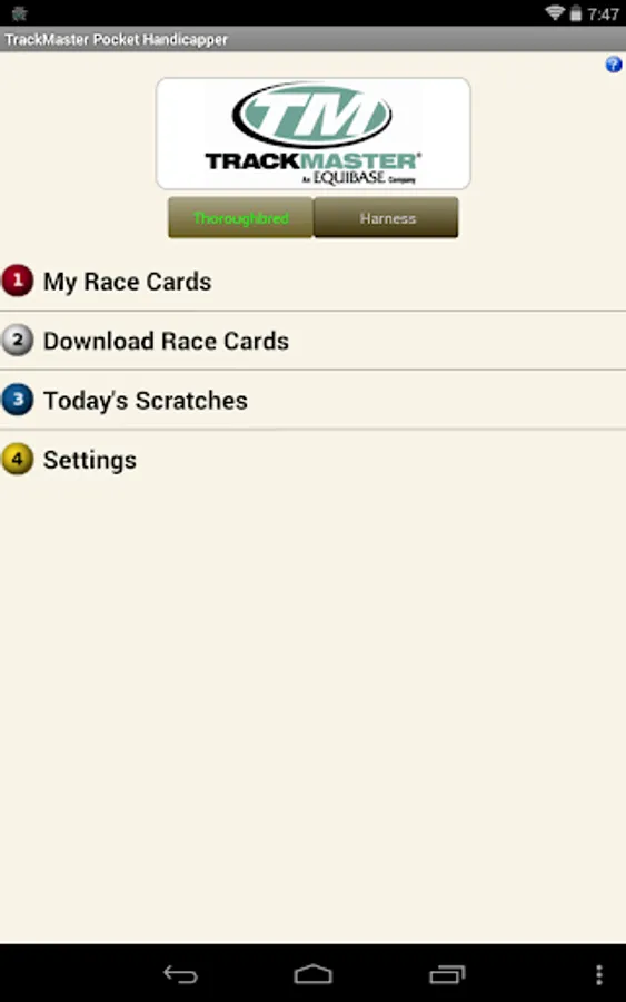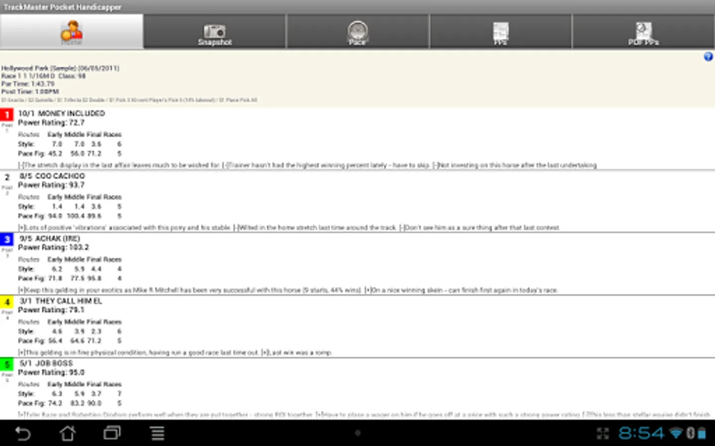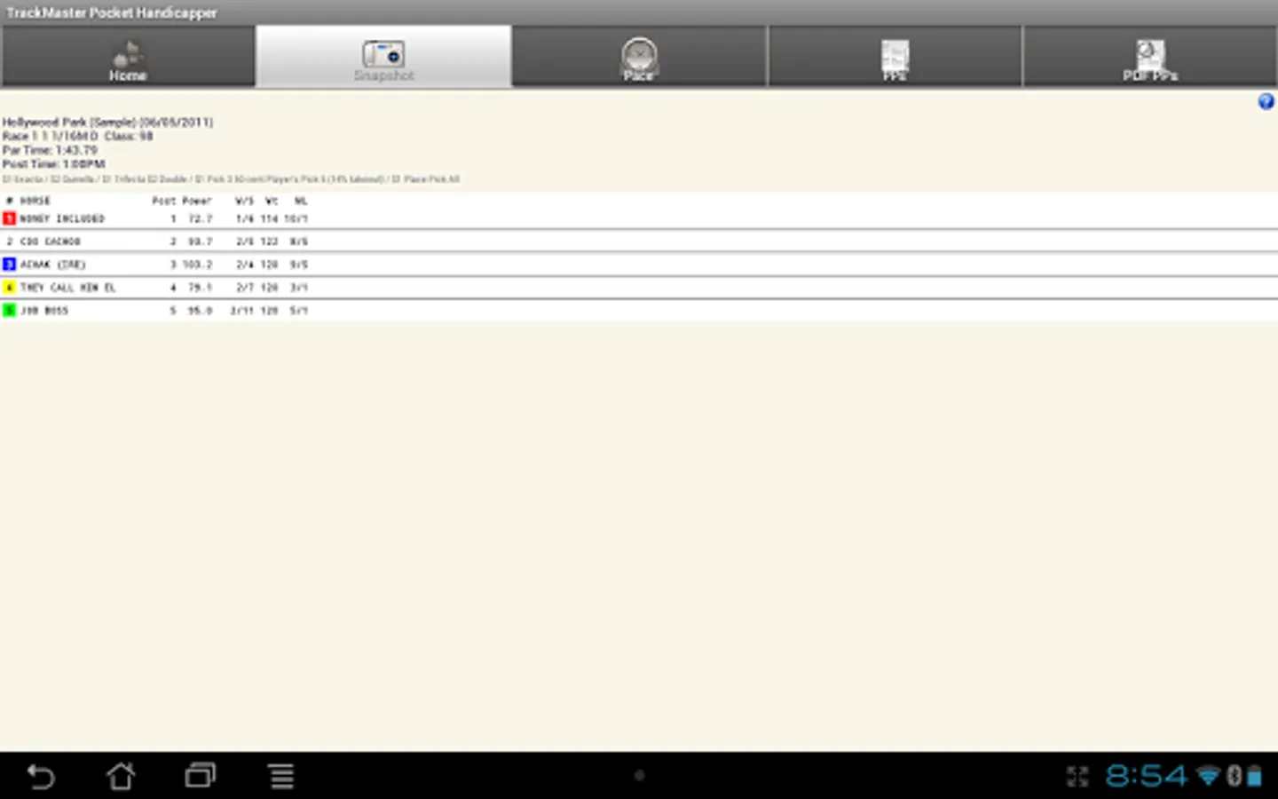The TrackMaster Pocket Handicapper is horse racing's leading choice for handicapping Thoroughbreds, Quarter Horses and Harness racing "on the go". This easy to use and easy to read app lets users go deep inside the vast amounts of exclusive ratings and statistics waiting to be unlocked inside each race. The TrackMaster Pocket Handicapper features the following horse racing handicapping information: