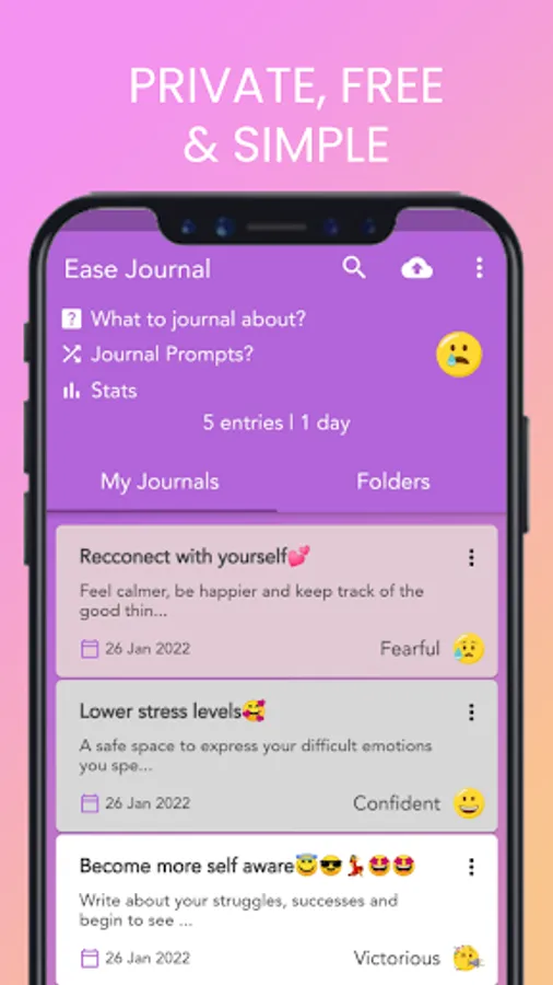 Ease journal is a free journal, diary with a lock, gratitude journal and mood tracker app for your mental health that will help you feel calmer and reduce anxiety.