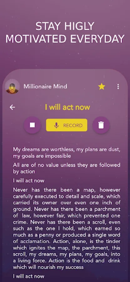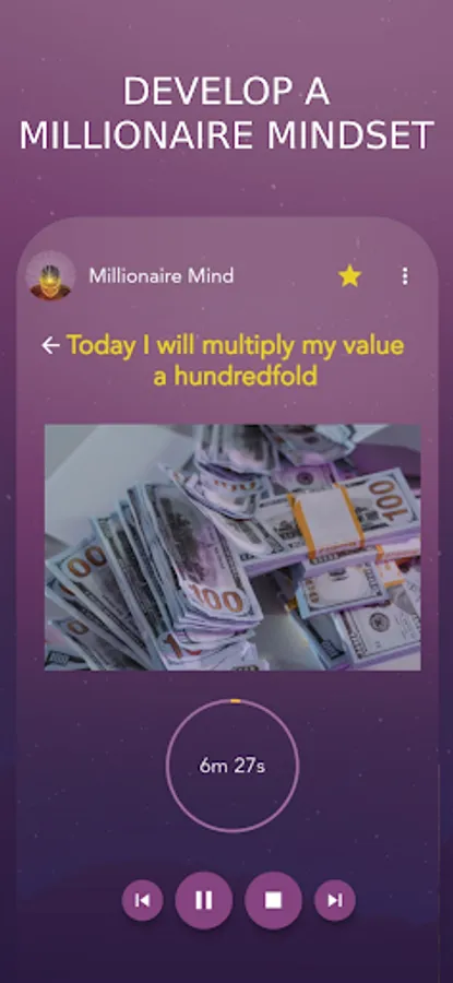 Millionaire Mind app contains positive declarations and affirmations about yourself, your life and business success. It is a practice of positive thinking that will help you believe in the possibility of your dreams and aspirations and affirm your dream life. This app contains The 10 scrolls from the greatest salesman in the world.