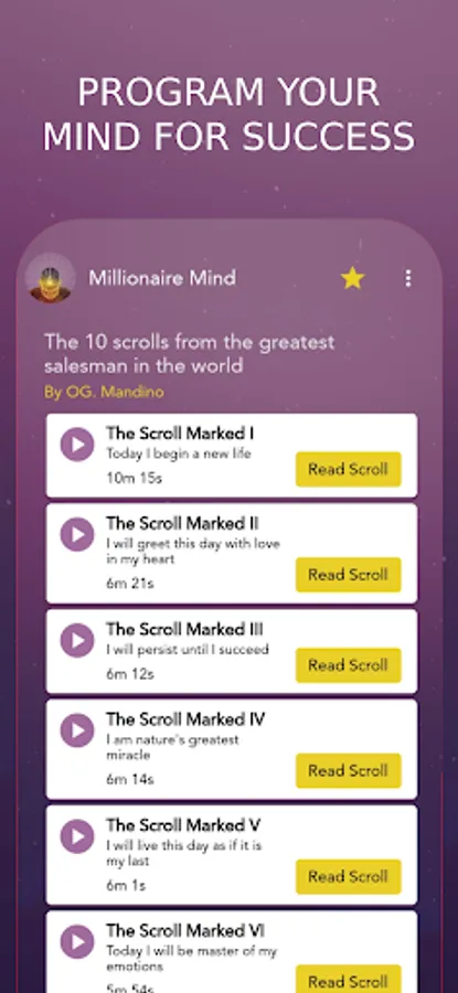 O. G Mandino’s “The Greatest Salesman in the World '' lays out timeless principles for personal success that have profoundly impacted millions of people around the world. Each scroll and positive affirmation in this app is specially worded to help you grasp the meaning behind the timeless principles. These scrolls are not for salespeople. They are for people who want to succeed in life. You will get re-energized to pursue your dreams everytime you listen to the audios or read scrolls again.