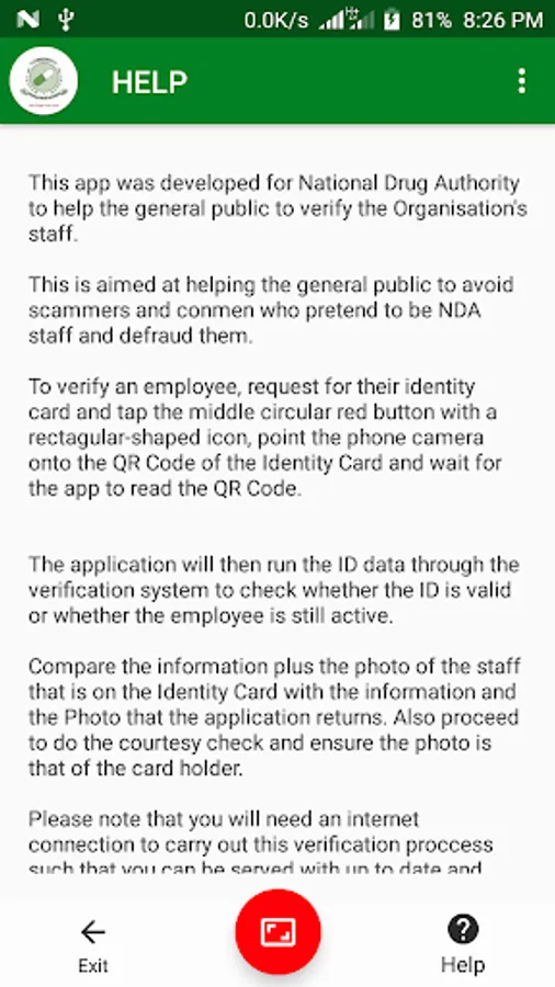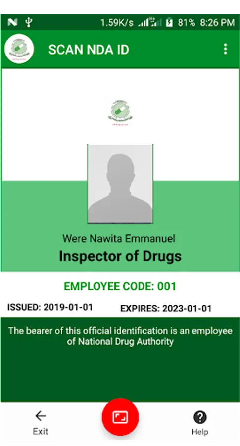 This is a National Drug Authority (NDA - UGANDA) mobile application developed for the general public to be able to verify organisation staff by scanning their identity cards.