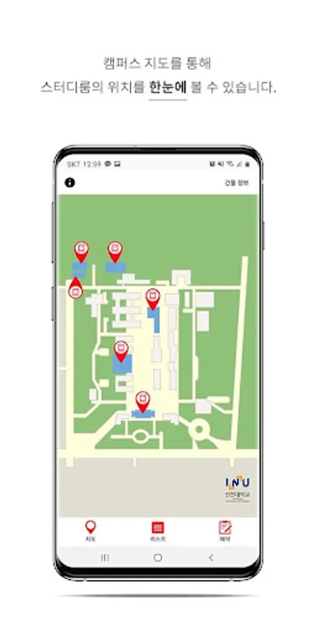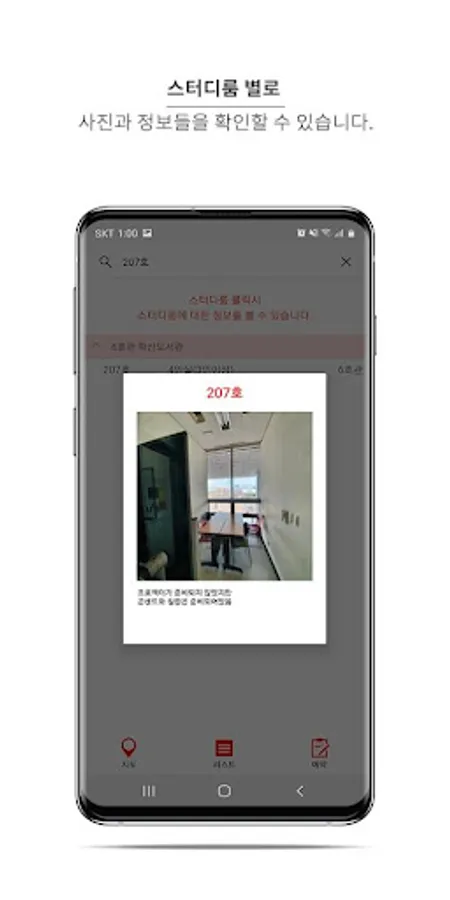 You can tell the location of the study room on campus and whether the study room is equipped with a blackboard, an outlet, a projector, etc., and check the status of the study room with an application.