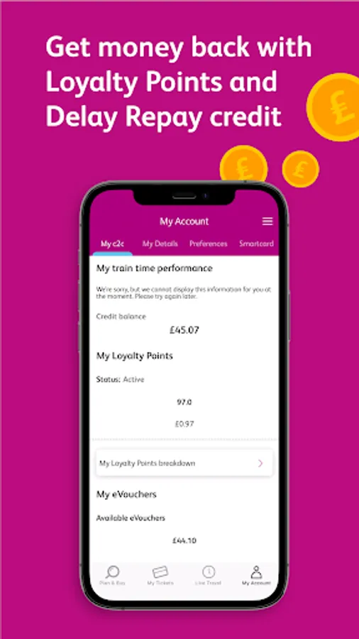 Use the c2c Train Travel app with a c2c Smartcard for maximum ease and rewards like loyalty points for money off future journeys and automatic repayment for delays over two minutes - no form filling required.