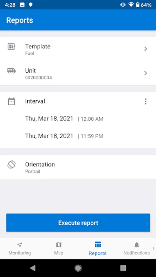 - Reports. Generate reports by selecting the unit, report template, time interval, and get analytics right where you are at the moment. PDF export is also available.