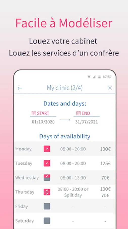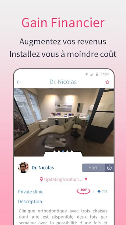 • Book your rentals of practices or professional premises that interest you and work with a colleague on your own or not, with your patient base or not.