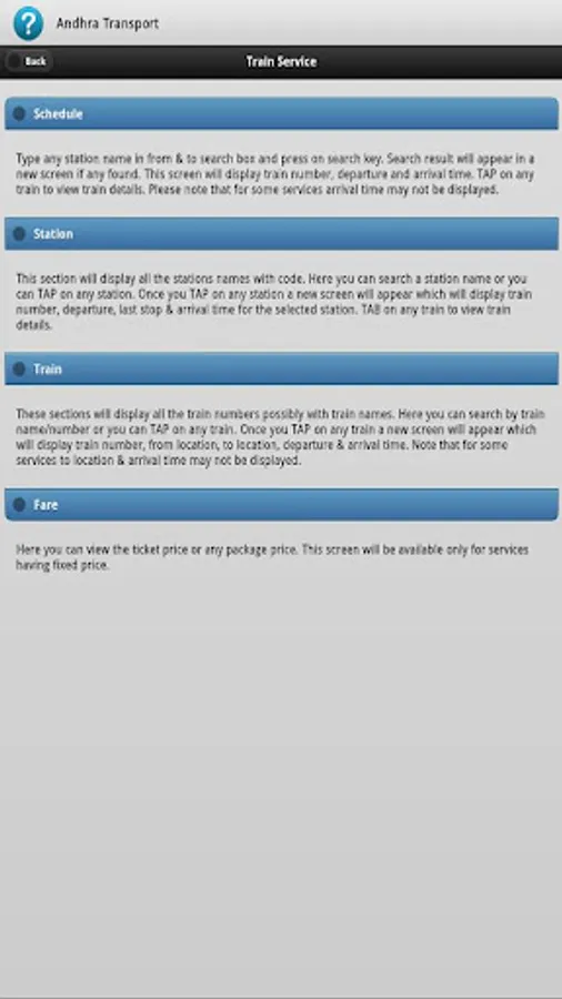 Andhra Transport is a useful application for every one traveling in-around Hyderabad. This application provides you times/routes for various transport services.