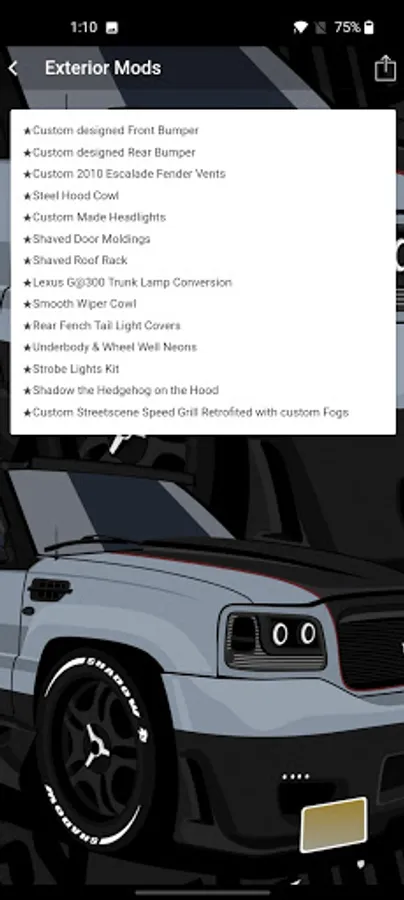 Follow the build from the car shows to your mobile phone! Made for judges in the show competition that want to see all mods done to the SHADOWSUV