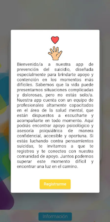 Welcome to our suicide prevention app, specially designed to provide you with support and containment in the most difficult moments. We know that life can present us with complicated and painful situations, but you are not alone. Our app has a team of highly trained professionals in the area of mental health, who are willing to listen to you and accompany you at all times. Here you can find psychological support and psychiatric advice in a confidential, accessible and timely manner. If you are struggling with suicidal thoughts, we invite you to download our app and connect with our support community. Together we can overcome this difficult time and find a light along the way.