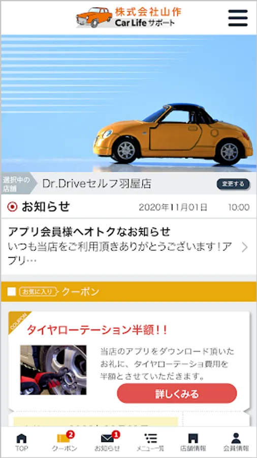 当社の公式アプリ「山作CarLifeサポート」ではアプリで簡単に洗車・コーティングなどのご予約や愛車のメンテナンス管理が可能の他、当店で利用いただけるお得なクーポンや各種メニューの割引情報を配信しております。