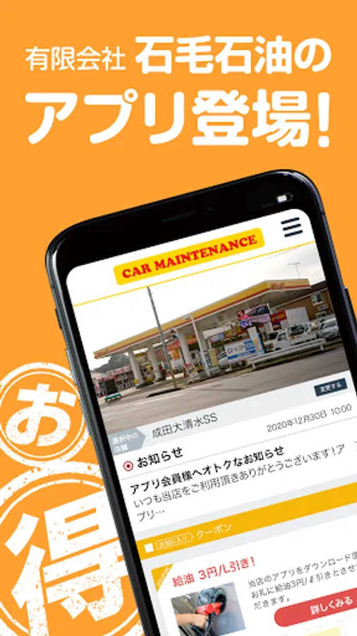 Our official app "Ishige Oil Car Maintenance" allows you to easily make reservations for car washing and coating, manage the maintenance of your car, and distribute discount coupons and discount information for various menus that can be used at our shop. We are here.