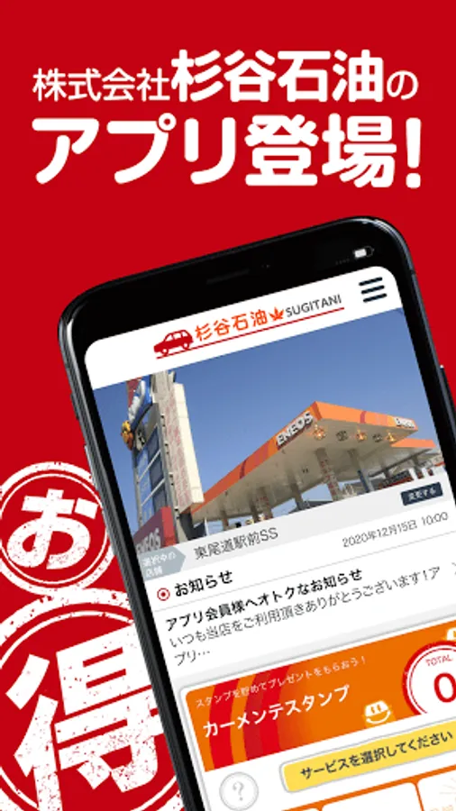 Our official app "Sugiya Oil" is a great value app that you can collect stamps every time you perform car maintenance, and if you accumulate a fixed number of stamps, you can exchange it for a great gift coupon. In addition to being able to easily make reservations and manage car washes and coatings, we also deliver discount coupons and discount information for various menus that can be used at registered stores.