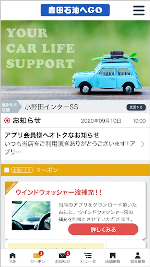 Our app "Go to Toyota Oil" allows you to easily make reservations for car washes, coatings, etc. and manage maintenance of your car, as well as coupons that can be used at registered stores and discount information on various menus. We are delivering.