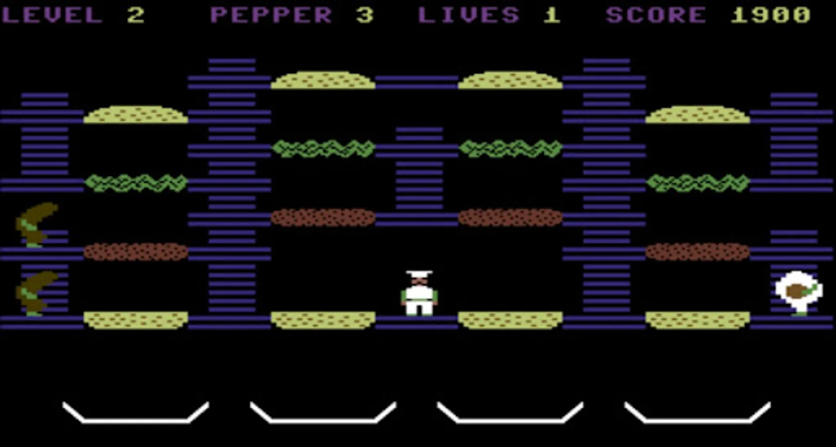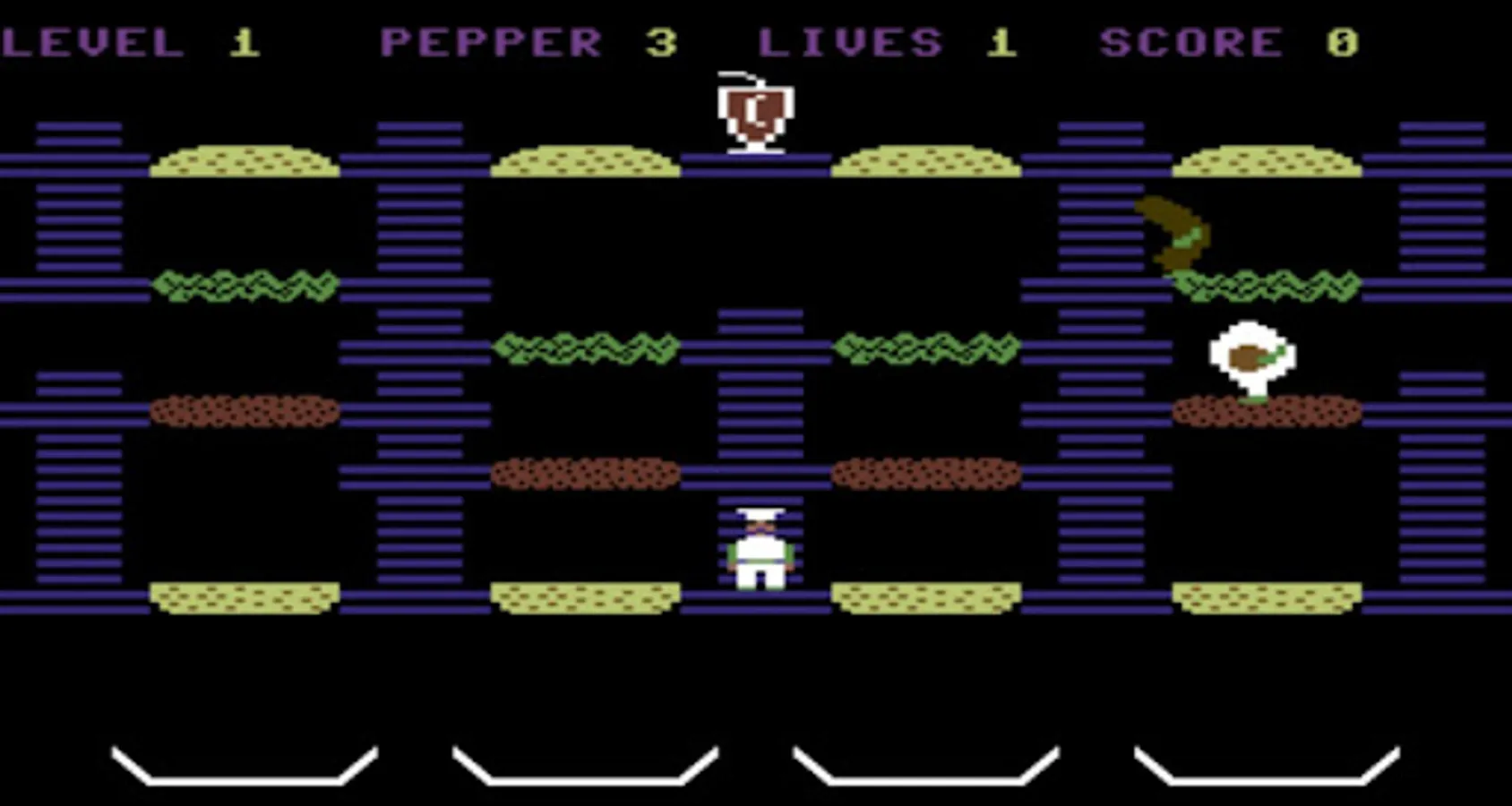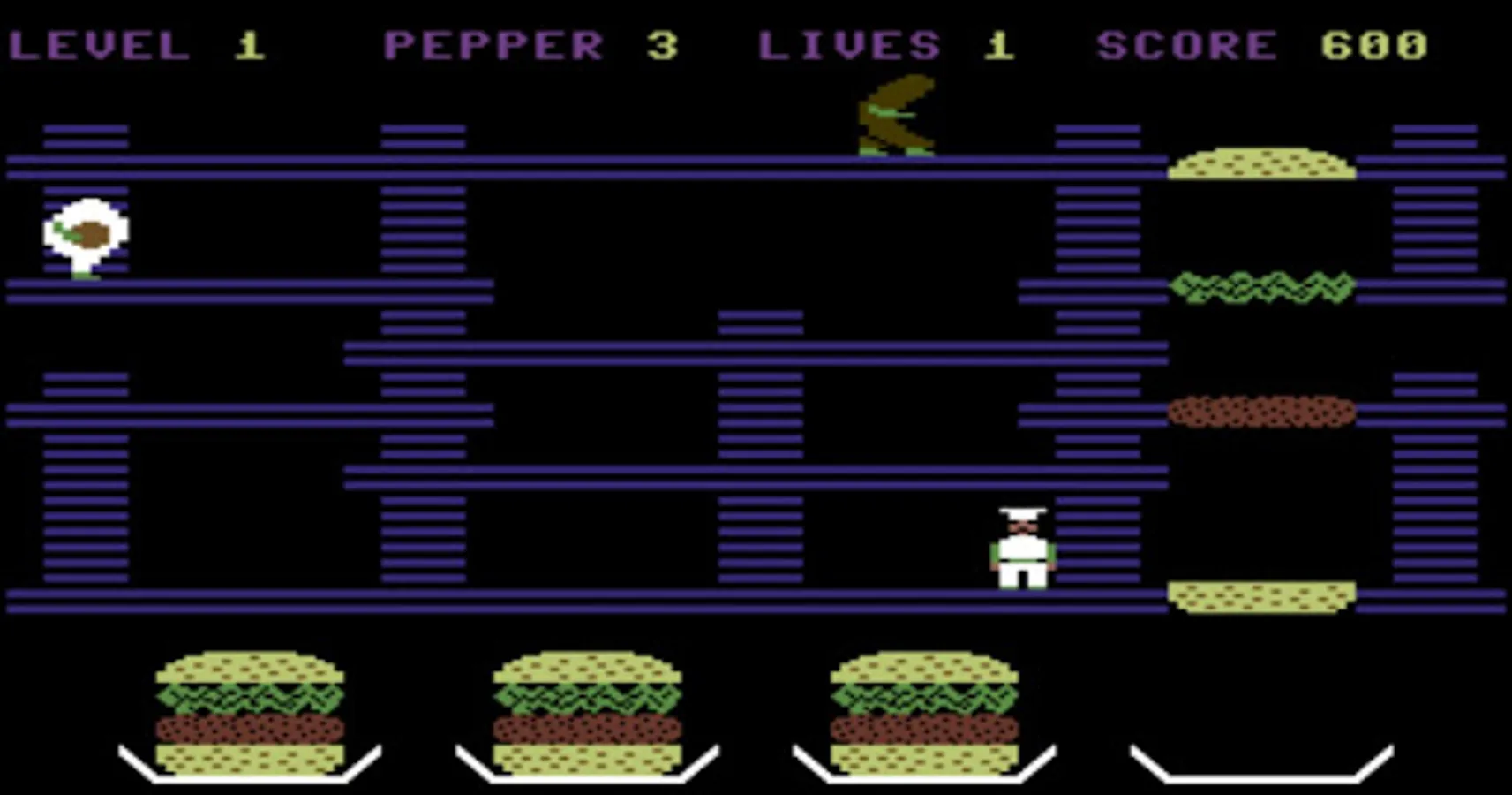 The single parts lie over each other on different platforms in a ladder labyrinth and to complete the burgers you need to move them downwards. This happens by walking over the parts!?! If you e.g. walk over the upper half of a bun every segment that you passed goes down a bit, when you have walked over the complete part it falls down a level. If there is another part lying on the level below (the salad leaf), then it will also be kicked another level lower. From the lowest level a part falls into the plate as soon as you walk over it! When you have all 4 burgers complete in the plates you have made the level.