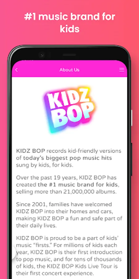 The KIDZ BOP Live app is your source for tour info, tickets, exclusives, fun photo filters, tour news and more. Get Ready For The Show: Get your tickets and check out KIDZ BOP videos to learn some moves Enjoy KIDZ BOP Live: Access exclusive in-app experiences at the shows, Stay informed with alerts + notifications Stay up to date on all things KIDZ BOP: After the show, get KIDZ BOP news including all future dates and fan exclusives right on the app About KIDZ BOP: KIDZ BOP connects with families through its best-selling albums, music videos, consumer products and live tours.