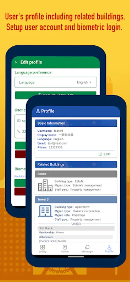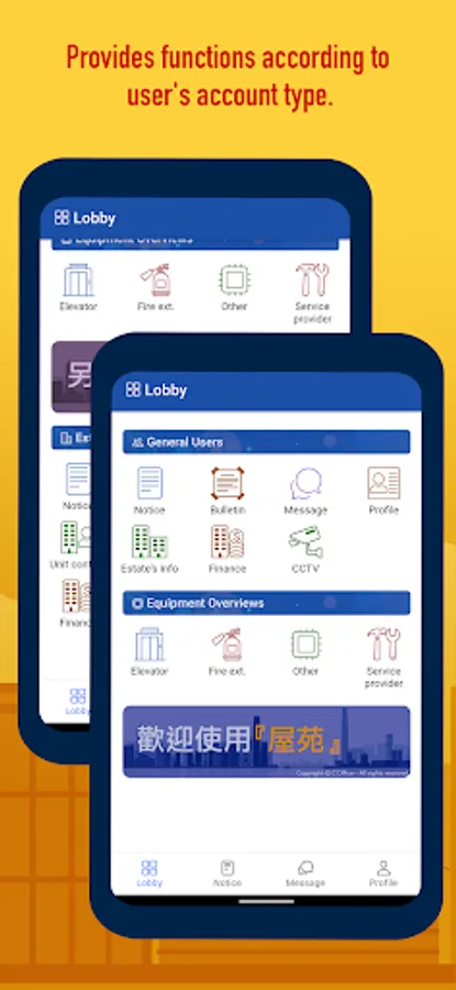 Functions and information provided by the App can be accessed by user corresponding to role(s) and authorization level(s) attached to the user account. For example, an apartment owner who works in the same estate, has the roles of 'Resident' and 'Staff', and can access all 'Resident/Tenant' functions and part of 'Staff' functions depending on staff level. A household worker has a 'Resident' role but can only access to a few 'Resident/Tenant' functions.