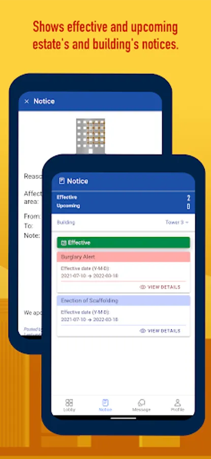 As as result, we develop "Estate" to assist management and information dissemination for estate. "Estate" is an auxiliary building management system made for estate with multi-residential-buildings. The system includes this APP and services running on the remote system server. The user APP - "Estate" connects and interacts with the remote services, and receives push notifications. Both residents and management staff can use this APP to retrieve information. Authorized management staff can even use it to send messages, post notices, update equipment statuses, etc.