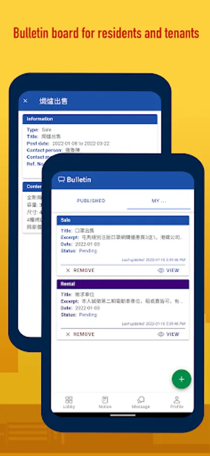 Nowadays, a lot of residential estates in Hong Kong and Macau hire property management companies to manage estate-related affairs. Most commonly, property management disseminates estate’s information by posting notices, delivering letters, and even through word of mouth from management staff. However, most of the time, residents tend to forget, miss and ignore what have been told. Also, by using these methods, urgent information (such as elevator stopped service, no water supply, etc) is difficult to reach residents on time. Moreover, information such as building equipment’s status, expiry, maintenance, etc. is always hard to retrieve by residents.