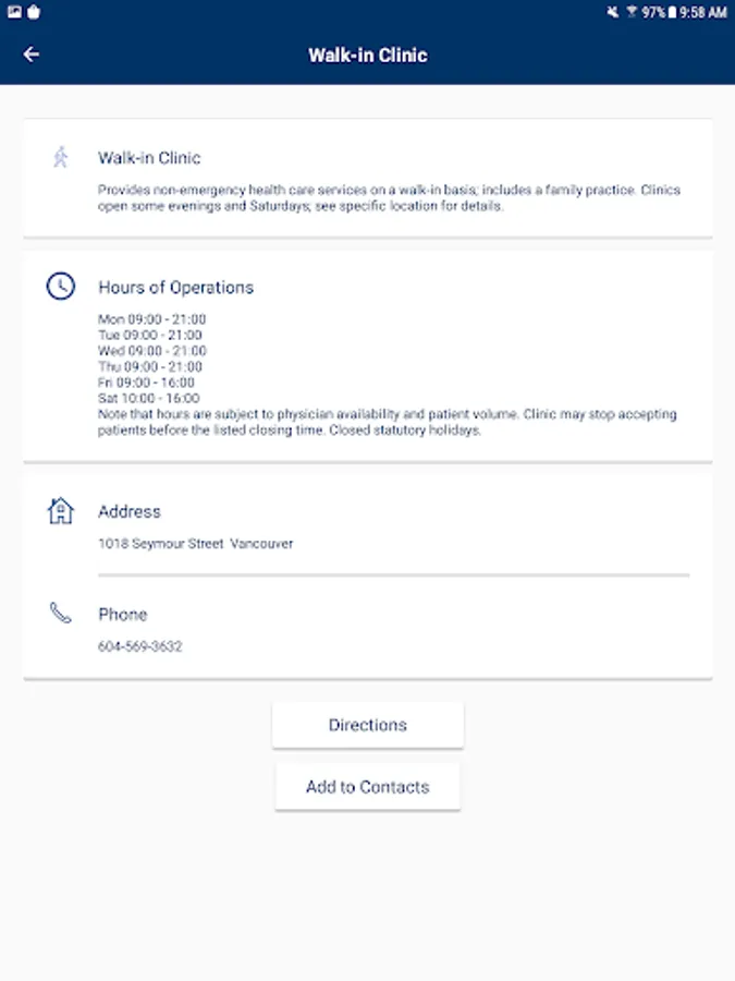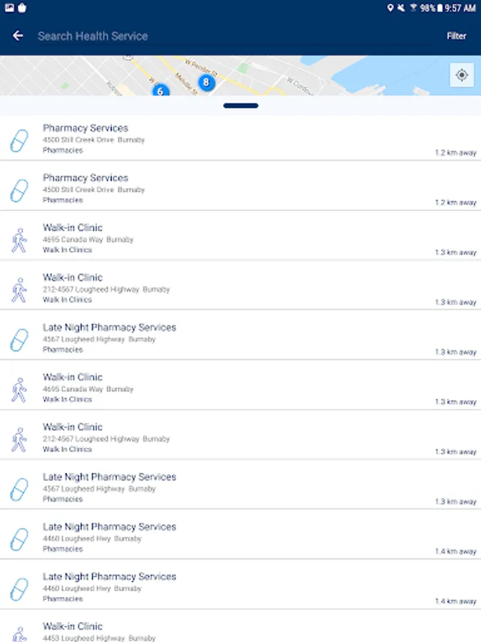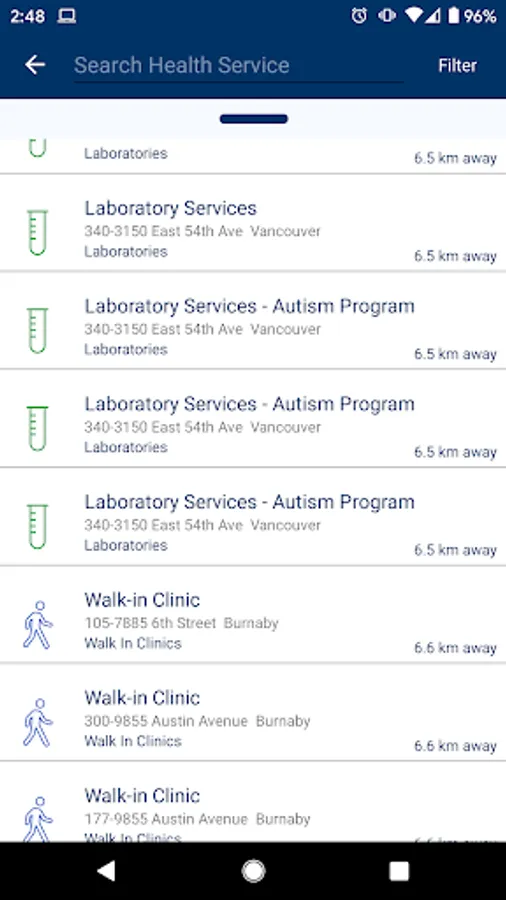 • Filter by types of services (i.e.: only walk-in clinics) and wheel chair accessibility