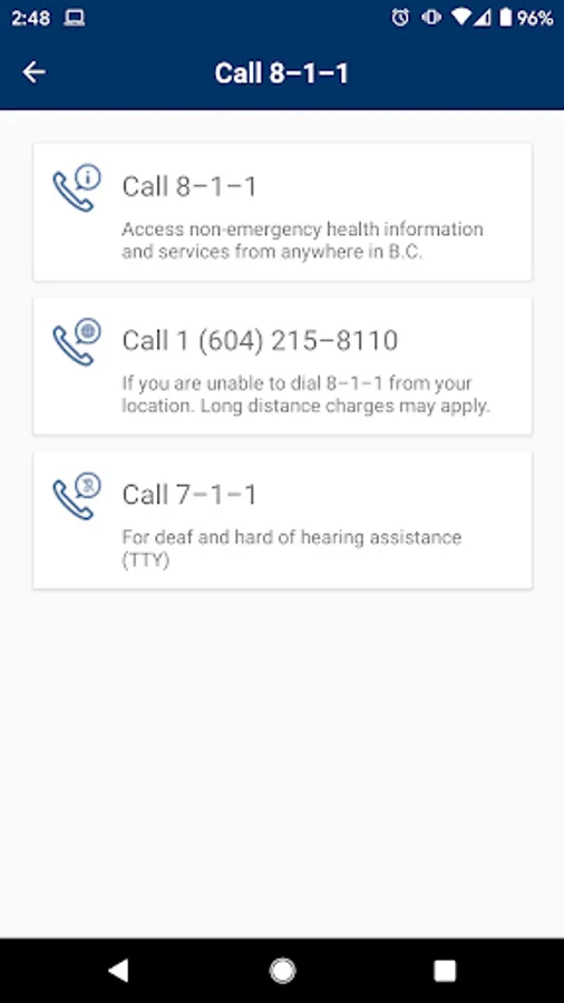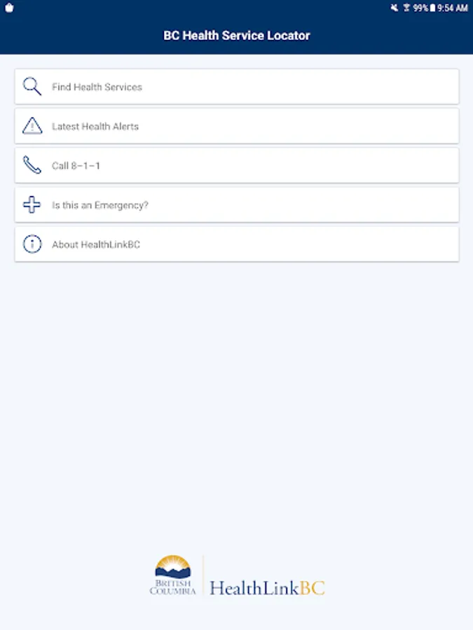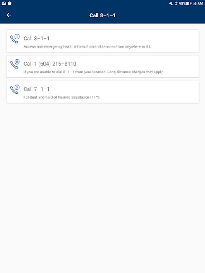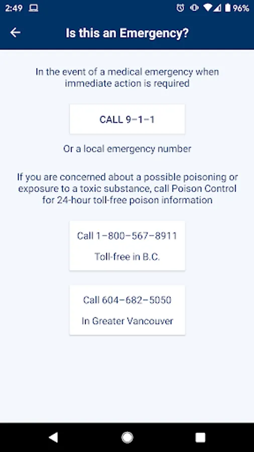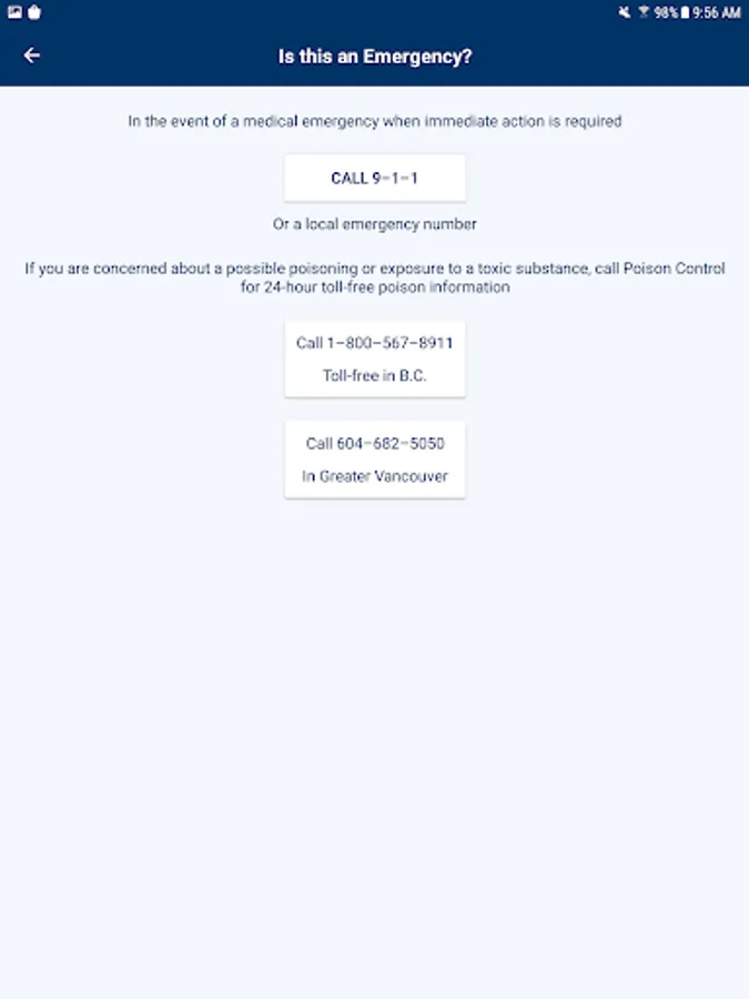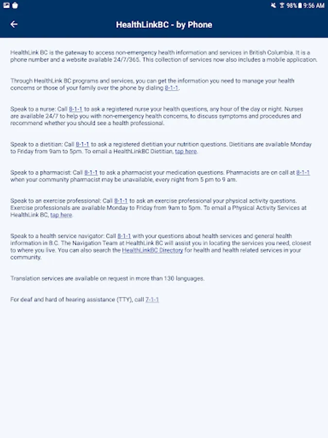 The app includes quick links to call our free of charge 8-1-1 provincial health information and advice phone line and access non-emergency health information and services in British Columbia.