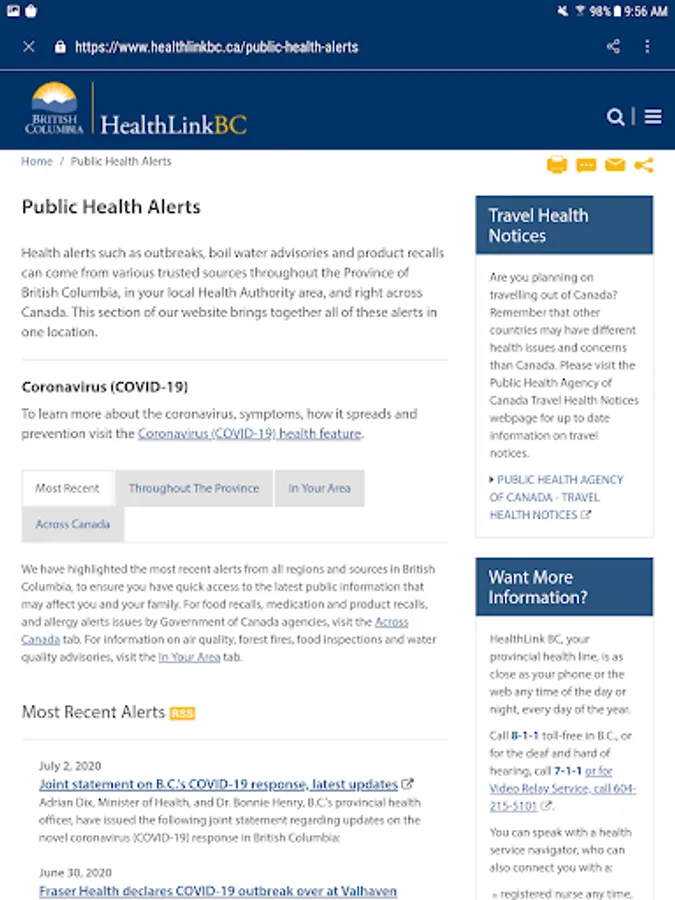 • View the Health Alerts posted on the HealthLinkBC website from within the app