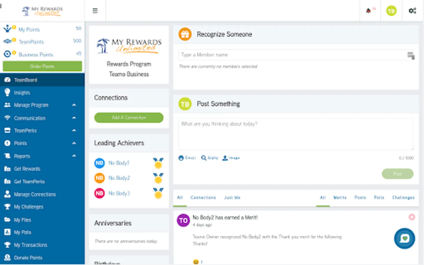 The Teamo (Canada) mobile application allows members to many of the benefits of the Teamo website in a compact feature focused application. Stay to up to date with the TeamBoard, recognize your peers, and redeem your points for rewards. In addition, if you have been assigned challenges or polls, or you want to comment or react on Posts or Merits, you can do it all in a couple of finger presses. Please note that you must have an account to login so please reach out to your business administrator for login credentials.