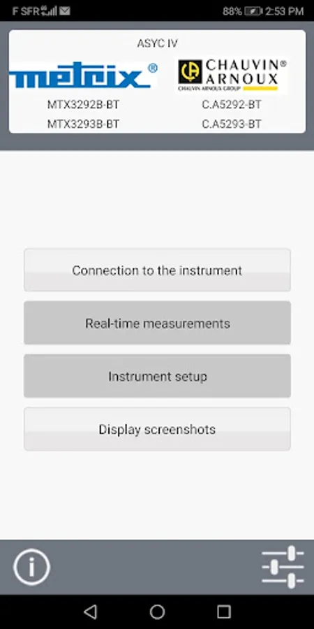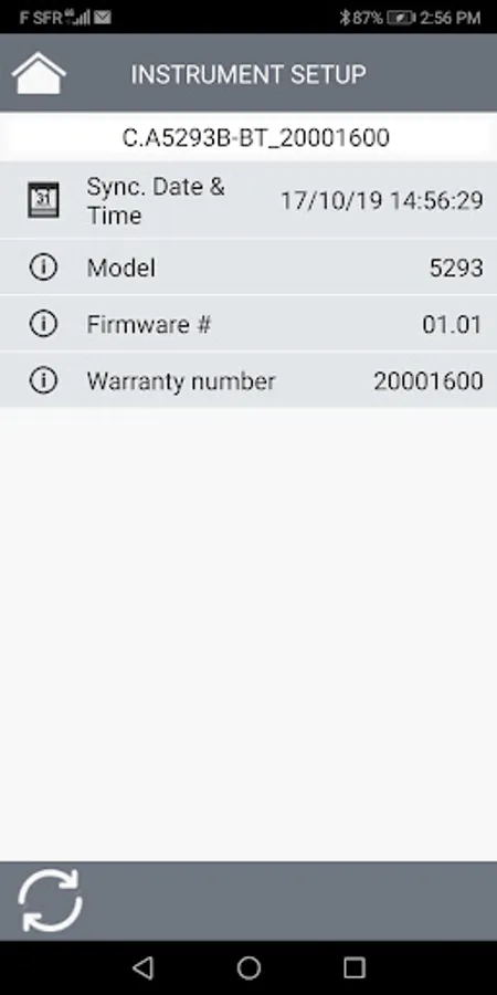 The Setup function proposes synchronization of the instrument date and time with the settings on the Android device