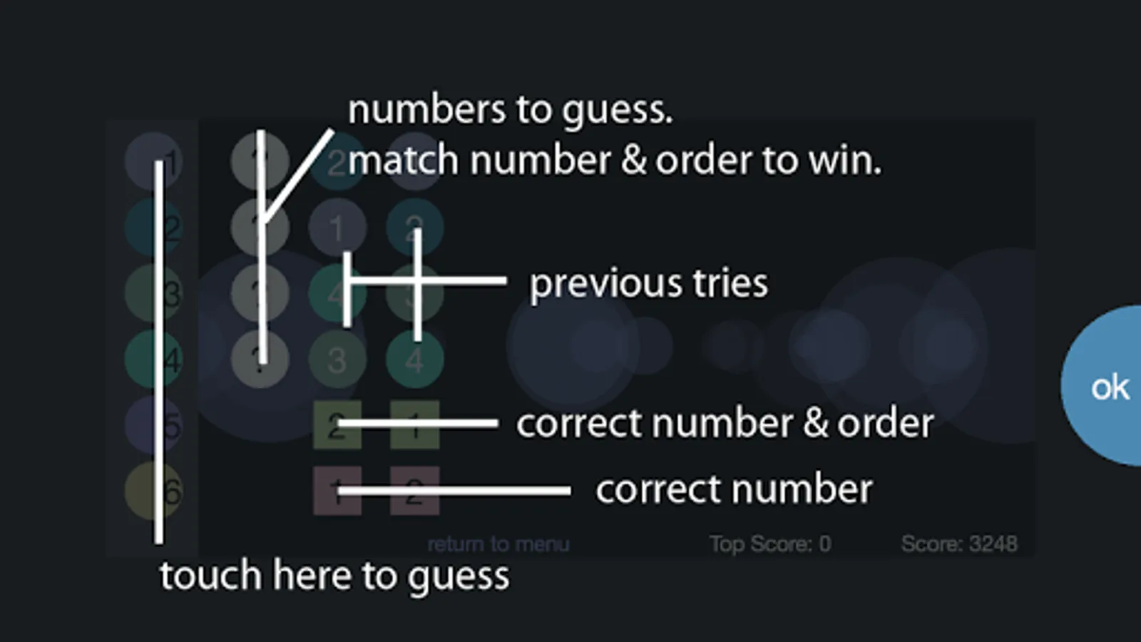 A classic paper and pencil game translated for the phone/tablet screen. Guess the 6 random hidden numbers by trying combinations of 10 numbers. This is the original cows & bulls classic game (with numbers). similar to Moo, Bagles, and Mastermind.