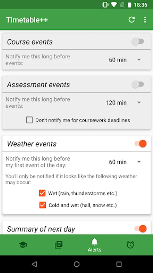 • Enable event summary alerts to get notified about the next day's events every evening.