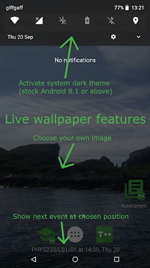 • Manually activate the system dark theme on stock Android 8.1 or above, while using any wallpaper image.
