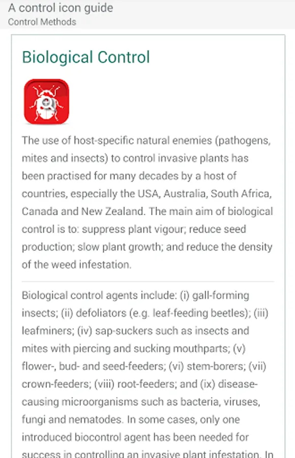 This app is a companion to the printed Guide to the Naturalized and Invasive Plants of Southeast Asia. The guide has been transformed into an app to make it accessible to users on their mobile device. It will be available offline, meaning a user will not have to have an internet connection to browse the guide, only to update it. Content can be browsed by plant type (e.g. aquatic, tree, shrub) or common name. A template SMS message can be found at the end of each factsheet which can be used to notify others of the location of a species.