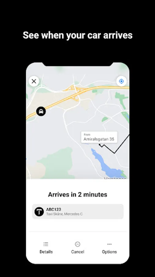 We notify you both when the taxi is on its way and when it has arrived. You can also follow your car on the map. The app provides you with the taxi's car number so you can smoothly and easily find your car! You find the taxi's car number on the back of the taxi sign.