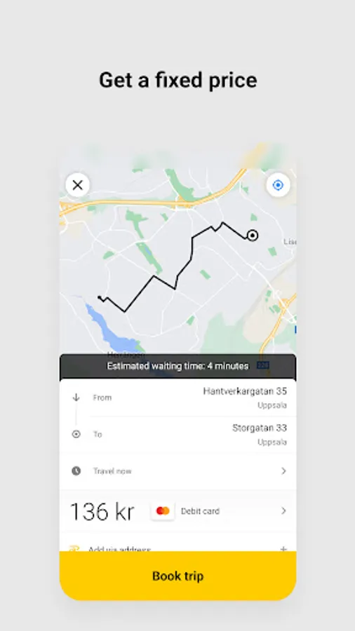 With the Uppsala Taxi app you book your taxi with ease. You’ll always get a fixed price on your trips and you’re able to pay by card or PayPal in the app to make your ride as smooth as possible. We’ll notify you both when the taxi is on its way and when it has arrived. You can also follow your car on the map.