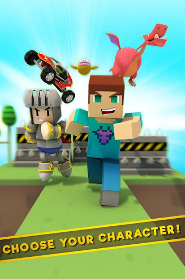 The survival racer can choose between super fast motorcycles, cars and other mad characters and drive around in block survival game!