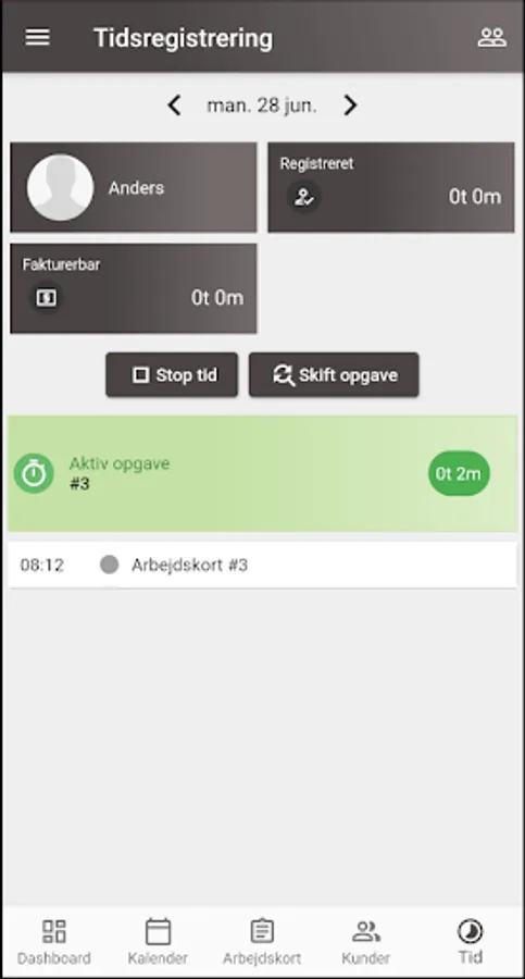 If you have time registration activated in au2office, you can quickly and easily start / change tasks in the app.