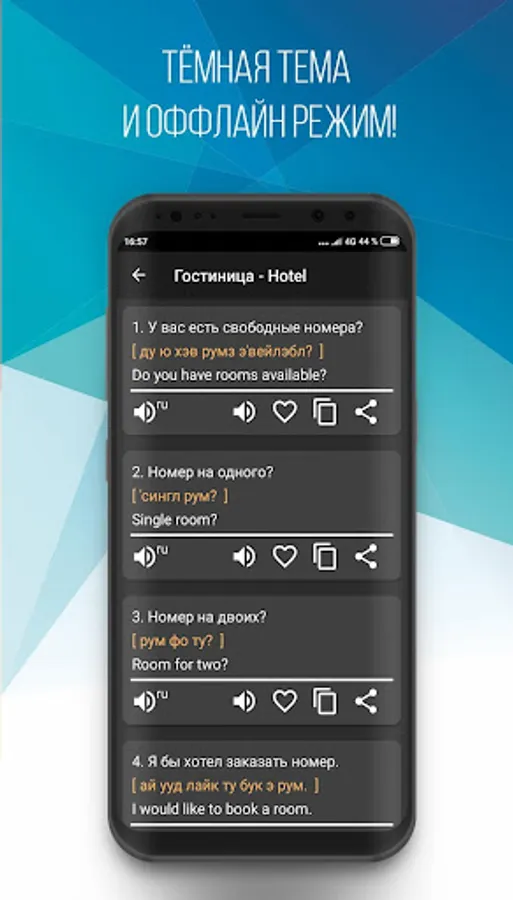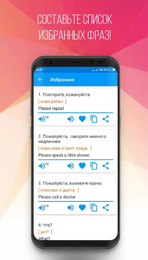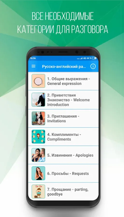 Russian - English phrasebook contains all the necessary words and phrases with pronunciation in two languages that you may need during your work trip or travel. When you click on the card, Russian phrases are played, when you click on the speaker icon, an English phrase is played.