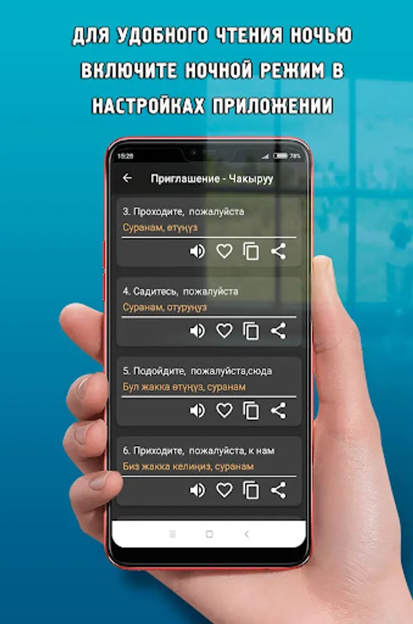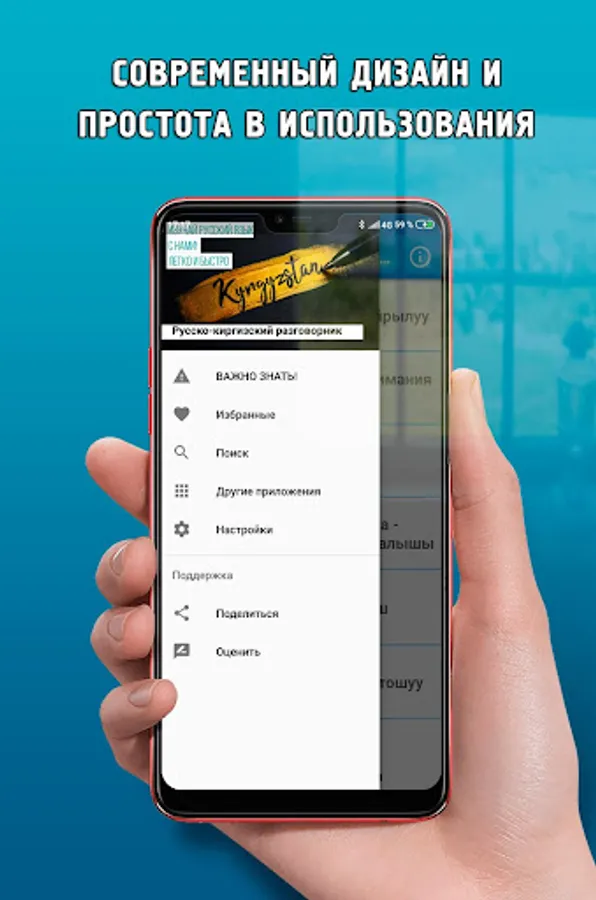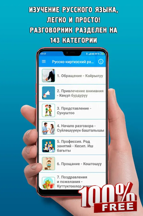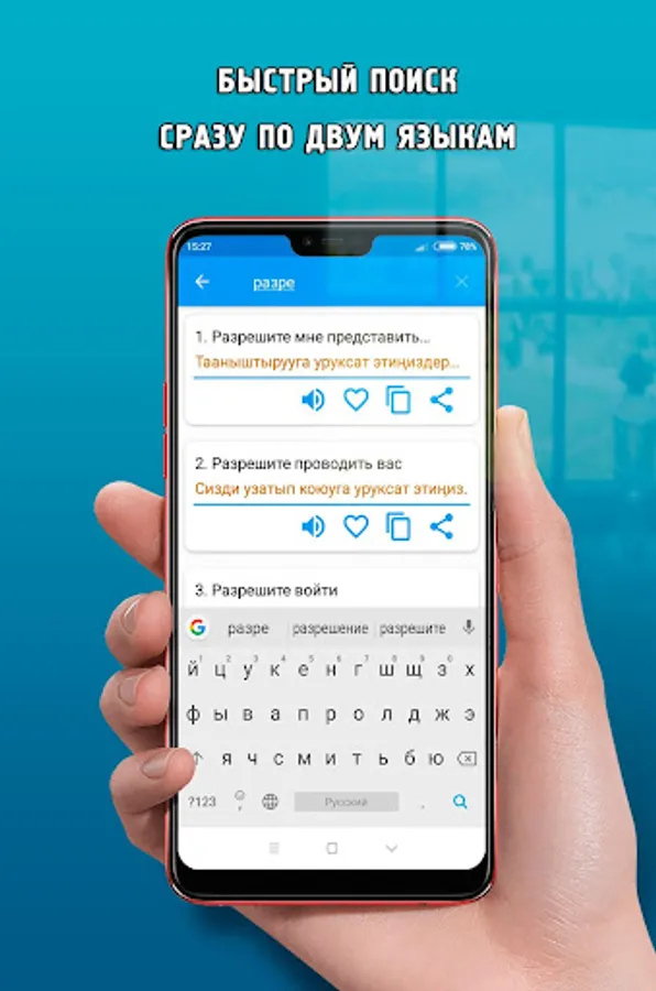 The Russian-Kyrgyz phrasebook contains all the necessary words and phrases that you may need during your work trip or travel. This application contains over 4100 phrases , which are sorted and grouped by topic with images. The most important thing in the application is the pronunciation of the phrase in Russian, this function allows you to learn Russian with the correct pronunciation. We did our best to make mastering and learning new phrases the most convenient!