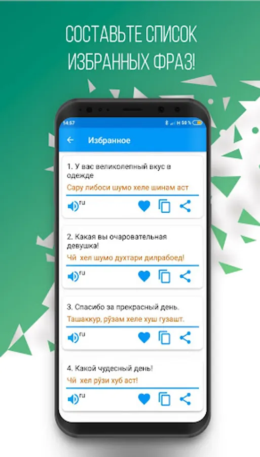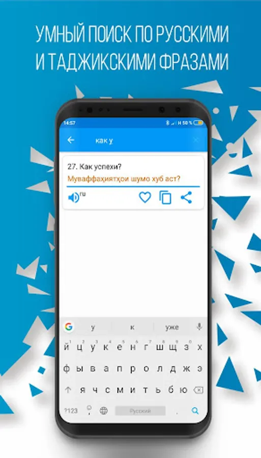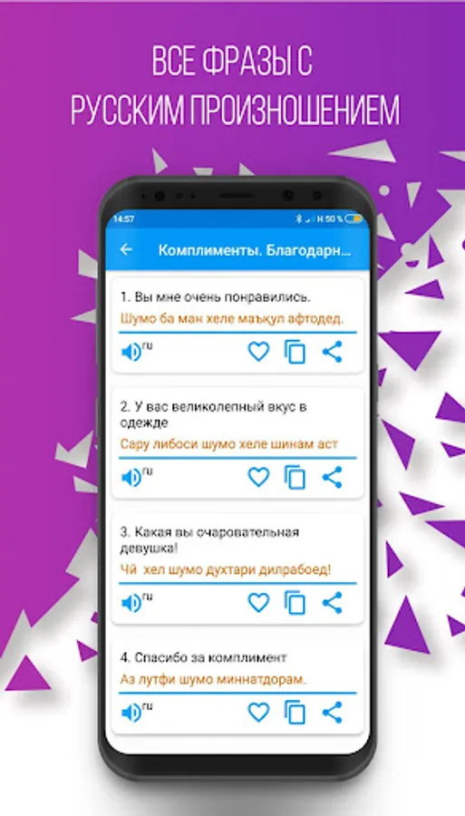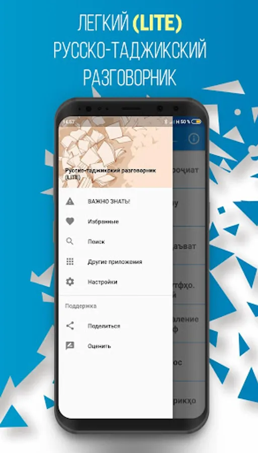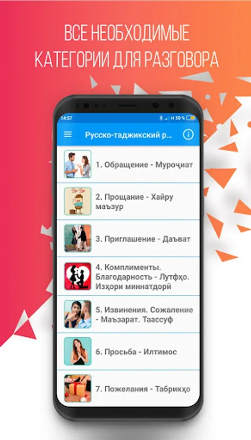 This phrasebook is a new and light version of the program "Russian-Tajik Phrasebook" and can be useful in communication between Tajiks and people who know Russian. It is compiled on the basis of an analysis of various international publications of this kind. The phrasebook includes the most common and used phrases, turns of speech and topics necessary for full-fledged communication between interlocutors, on topics such as: Everyday phrases "," Travel "," Hotel "," In a restaurant "," Shopping "," Excursions "," Means of communication "," In the bank "," Transport "," Health "," Beauty salon "," Call the police ".