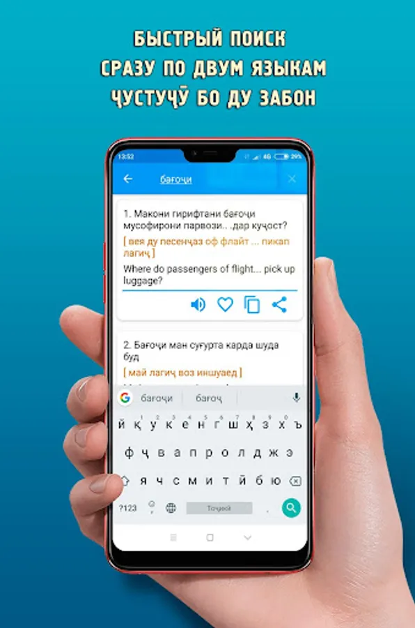 Use the search function to quickly find the phrase you need in two languages at once. Add your most frequently used phrases to your favorites list. You do not need an internet connection to use this application. Therefore, you can use the application and learn the language anywhere!