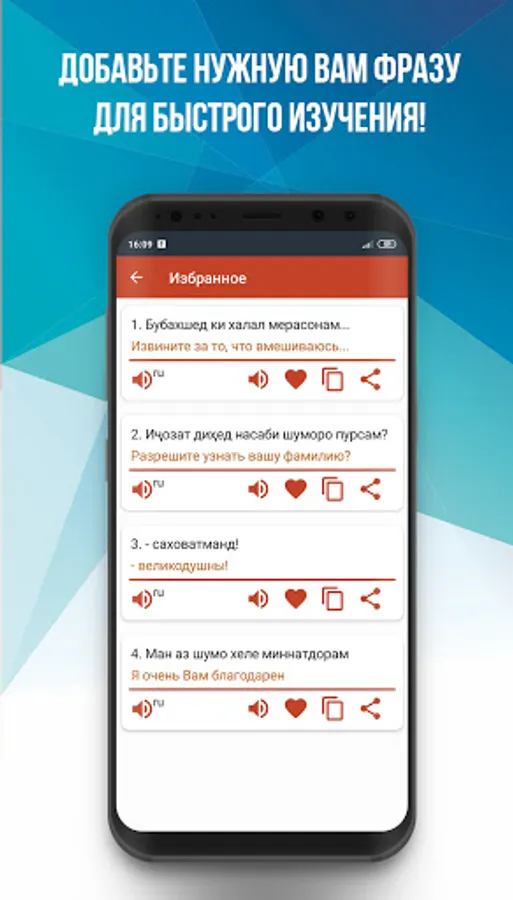❤️The phrasebook will also help you in learning and improving the language: phrases can be saved in the "favorites" section for quick access and further practice of pronunciation.