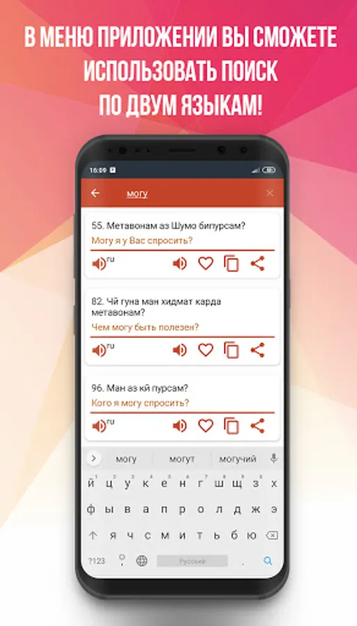 👉The application not only provides access to a large and easy-to-use dictionary, but also helps you learn to speak correctly thanks to the function of voice playback of Russian, Tajik words and phrases.