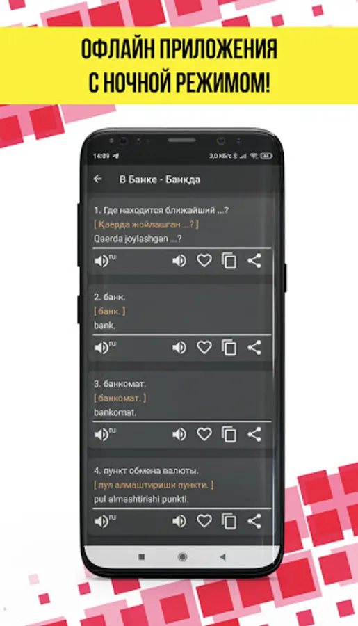 👉 Phrasebook is an excellent assistant for those who know Russian / Uzbek, and an indispensable companion for everyone who is just starting to learn the language. The phrasebook works completely without an internet connection.
